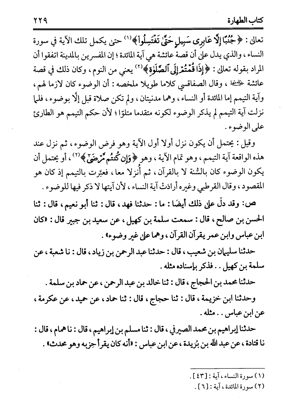 تعالى: {جُنُبًا إِلَّا عَابِرِي سَبِيلٍ حَتَّى تَغْتَسِلُوا} (¬1) حتى يكمل تلك الآية في سورة النساء، والذي يدل على أن قصة عائشة هي آية المائدة؛ إن المفسرين بالمدينة اتفقوا أن المراد بقوله تعالى: {إِذَا قُمْتُمْ إِلَى الصَّلَاةِ} (¬2) يعني من النوم، وكان ذلك في قصة عائشة - رضي الله عنها -، وقال الصفاقسي كلاما طويلًا ملخصه: أن الوضوء كان لازما لهم، وآية التيمم إما المائدة أو النساء، وهما مدنيتان، ولم تكن صلاة قبل إلاَّ بوضوء، فلما نزلت آية التيمم لم يذكر الوضوء لكونه متقدما متلوّا؛ لأن حكم التيمم هو الطارئ على الوضوء.
