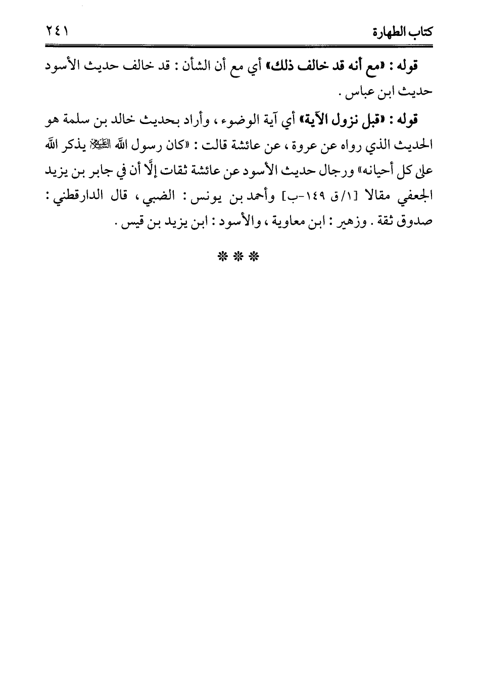 قوله: "قبل نزول الاية" أي آية الوضوء، وأراد بحديث خالد بن سلمة هو الحديث الذي رواه عن عروة، عن عائشة قالت: "كان رسول الله - عليه السلام - يذكر الله على كل أحيانه" ورجال حديث الأسود عن عائشة ثقات إلاَّ أن في جابر بن يزيد الجعفي مقالا وأحمد بن يونس: الضبي، قال الدارقطني: صدوق ثقة. وزهير: ابن معاوية، والأسود: ابن يزيد بن قيس.