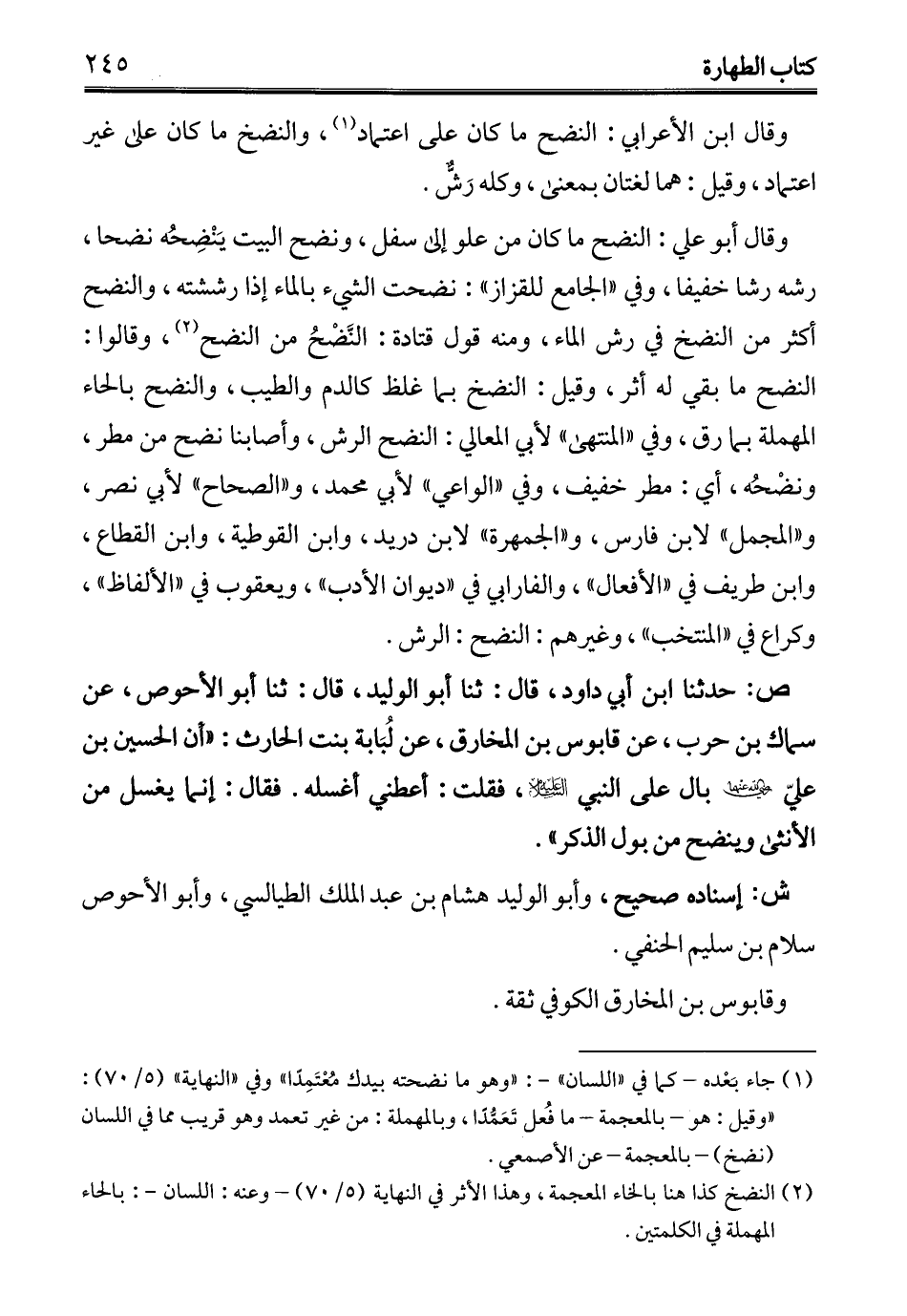 ص: حدثنا ابن أبي داود، قال: ثنا أبو الوليد، قال: ثنا أبو الأحوص، عن سماك بن حرب، عن قابوس بن المخارق، عن لُبَابة بنت الحارث: "أن الحسين بن عليّ - رضي الله عنهما - بال على النبي - عليه السلام -، فقلت: أعطني أغسله. فقال: إنما يغسل من الأنثى وينضح من بول الذكر".
