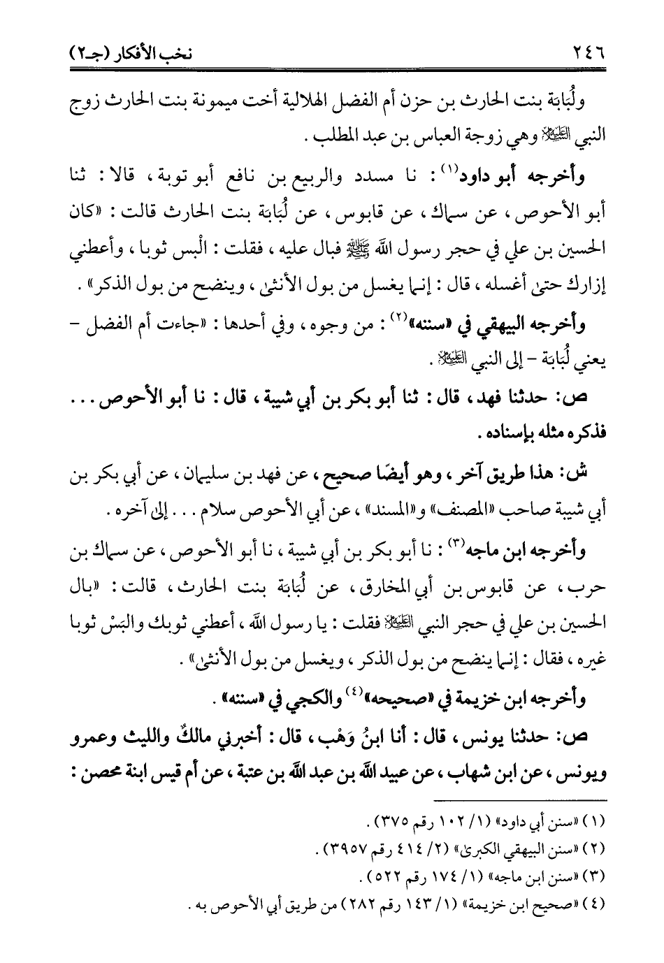 وأخرجه أبو داود (¬1): نا مسدد والربيع بن نافع أبو توبة، قالا: ثنا أبو الأحوص، عن سماك، عن قابوس، عن لُبَابَة بنت الحارث قالت: "كان الحسن بن علي في حجر رسول الله - صلى الله عليه وسلم - فبال عليه، فقلت: الْبس ثوبا، وأعطني إزارك حتى أغسله، قال: إنما يغسل من بول الأنثى، وينضح من بول الذكر".
