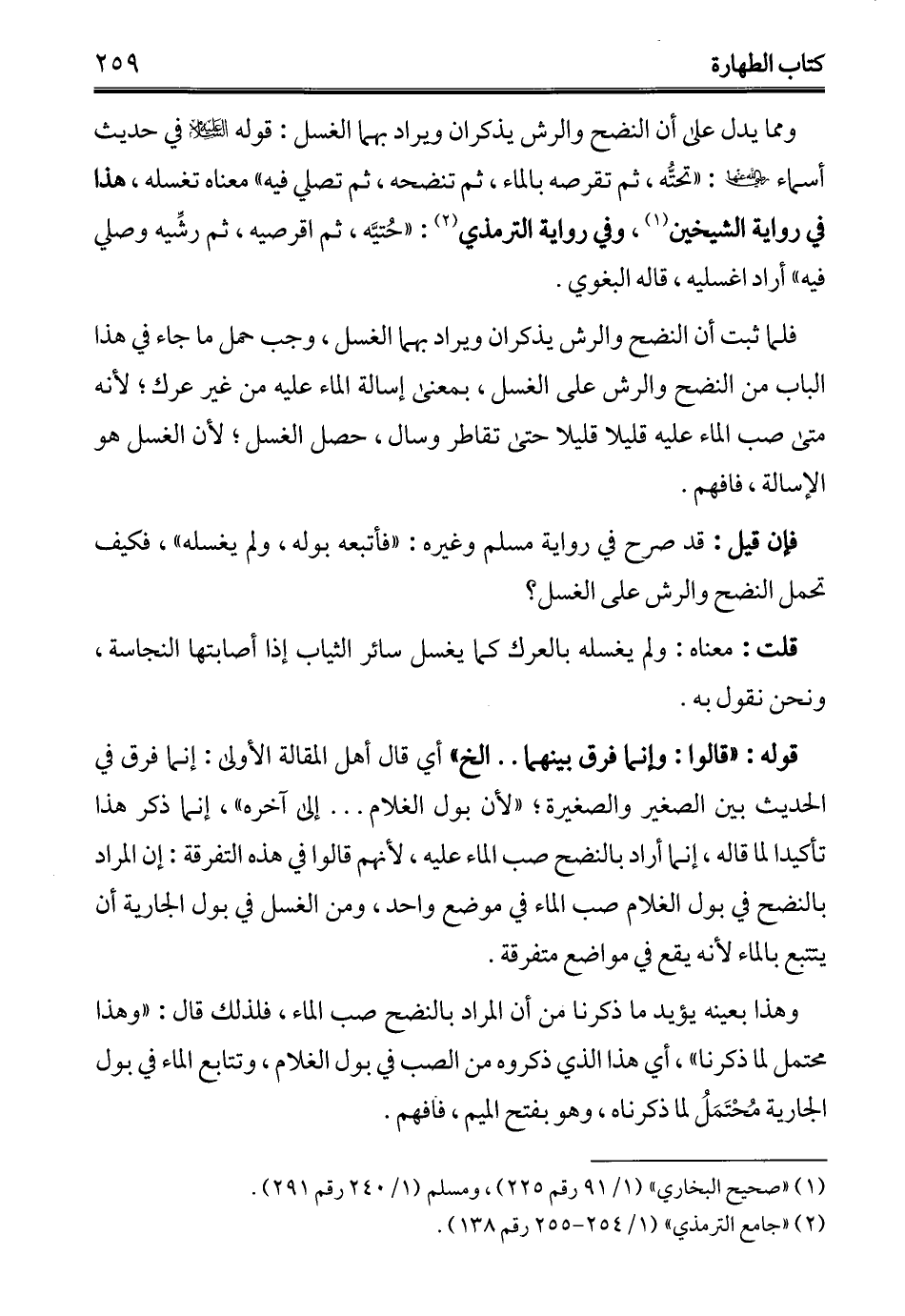 ومما يدل على أن النضح والرش يذكران ويراد بهما الغسل: قوله - عليه السلام - في حديث أسماء - رضي الله عنها -: "تحتُّه، ثم تقرصه بالماء، ثم تنضحه، ثم تصلي فيه" معناه تغسله، هذا في رواية الشيخين (¬1)، وفي رواية الترمذي (¬2): "حُتيَّه، ثم اقرصيه، ثم رشِّيه وصلي فيه" أراد اغسليه، قاله البغوي.