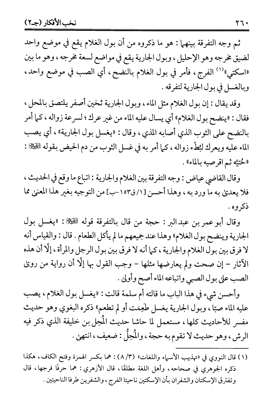 ثم وجه التفرقة بينهما: هو ما ذكروه من أن بول الغلام يقع في موضع واحد لضيق مخرجه وهو الإحليل، وبول الجارية يقع في مواضع لسعة مخرجه، وهو ما بين "اسكتي" (¬1) الفرج، فأمر في بول الغلام بالنضح، أي الصب في موضع واحد، وبالغسل في بول الجارية لتفرقه.