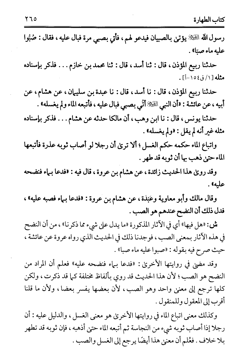 رسول الله - عليه السلام - يؤتى بالصييان فيدعو لهم، فأتي بصبي مرة فبال عليه، فقال: صُبُّوا عليه ماء صبّا".
