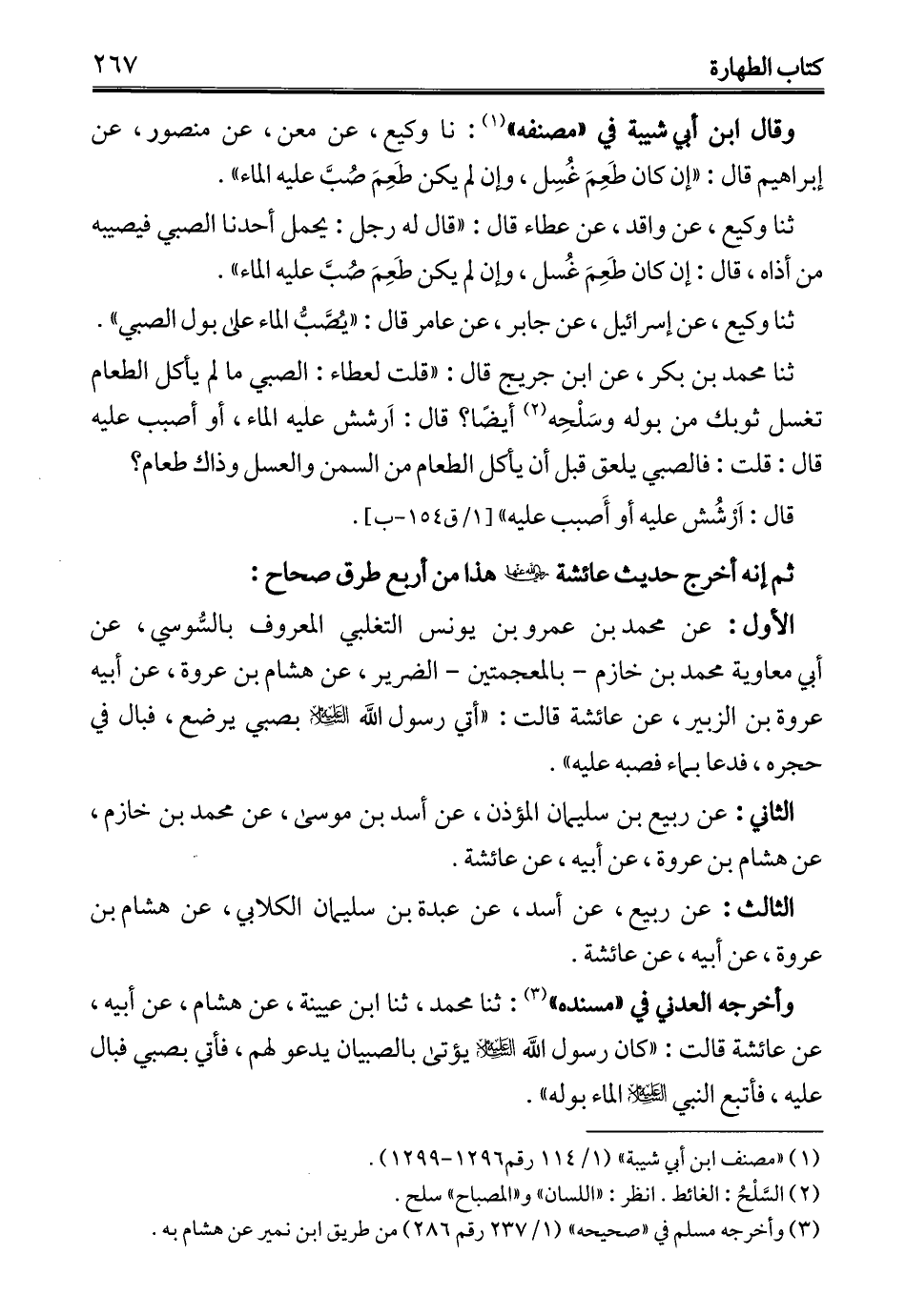 الأول: عن محمد بن عمرو بن يونس التغلبي المعروف بالسُّوسي، عن أبي معاوية محمَّد بن خازم -بالمعجمتين- الضرير، عن هشام بن عروة، عن أبيه عروة بن الزبير، عن عائشة قالت: "أتي رسول الله - عليه السلام - بصبي يرضع، فبال في حجره، فدعا بماء فصبه عليه".