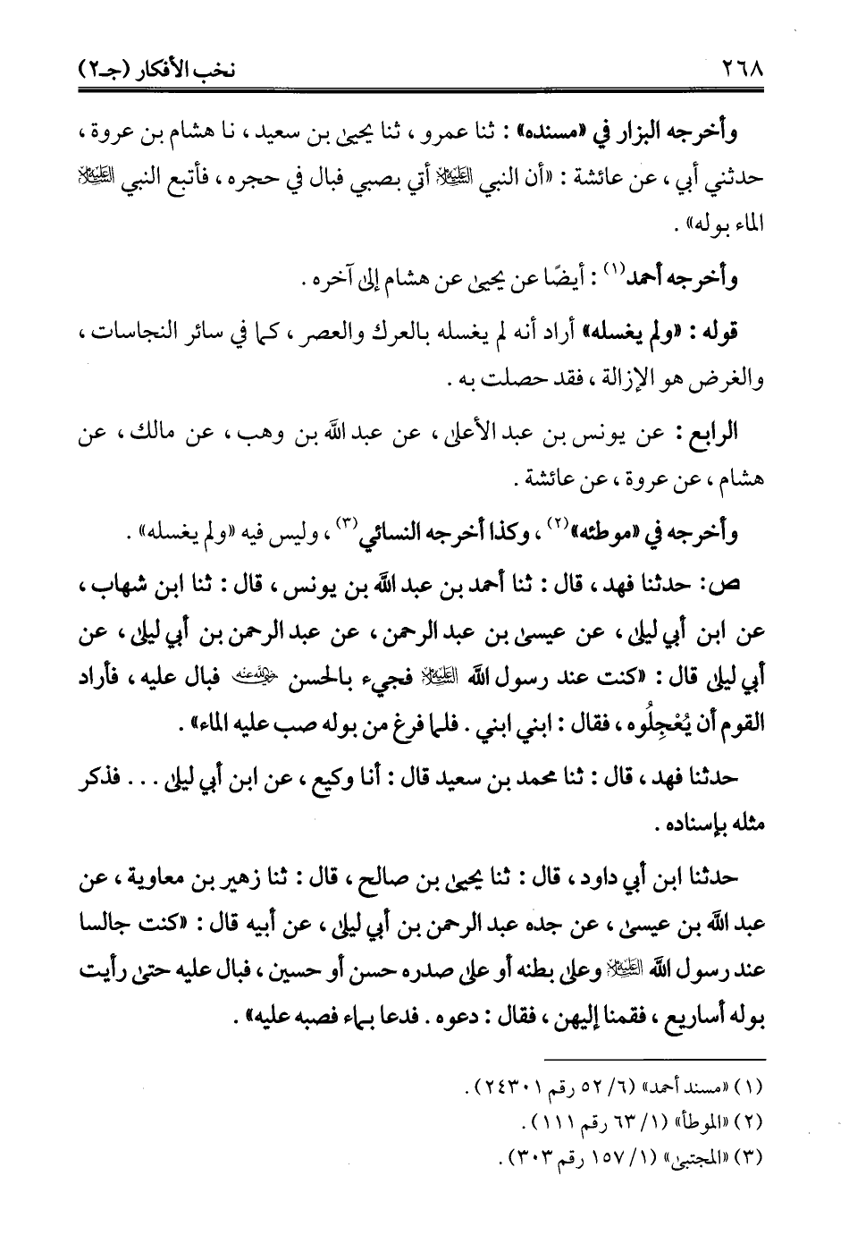 وأخرجه البزار في "مسنده": ثنا عمرو، ثنا يحيى بن سعيد، نا هشام بن عروة، حدثني أبي، عن عائشة: "أن النبي - عليه السلام - أتي بصبي فبال في حجره، فأتبع النبي - عليه السلام - الماء بوله".