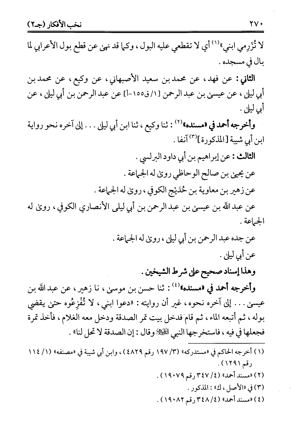 وأخرجه أحمد "مسنده" (¬4): ثنا حسن بن موسول، نا زهير، عن عبد الله بن عيسى ... إلى آخره نحوه، غير أن روايته: "دعوا ابني، لا تُفْزِعُوه حتى يقضي بوله، ثم أتبعه الماء، ثم قام فدخل بيت تمر الصدقة ودخل معه الغلام، فأخذ تمرة فجعلها في فيه، فاستخرجها النبي - عليه السلام - وقال: إن الصدقة لا تحل لنا".