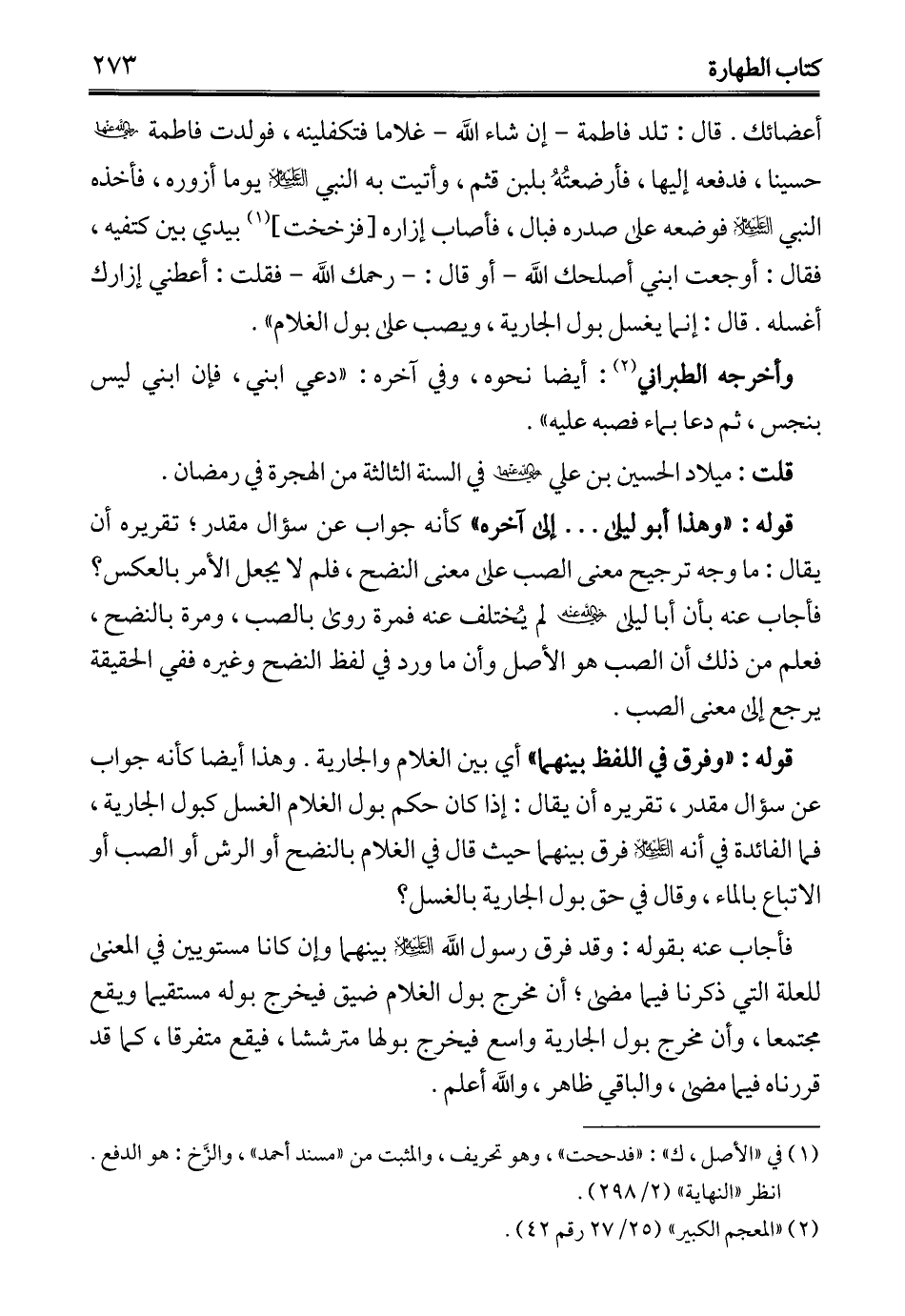 أعضائك. قال: تلد فاطمة -إن شاء الله- غلاما فتكفلينه، فولدت فاطمة - رضي الله عنها - حسينا، فدفعه إليها، فأرضعتُهُ بلبن قثم، وأتيت به النبي - عليه السلام - يوما أزوره، فأخذه النبي - عليه السلام - فوضعه على صدره فبال، فأصاب إزاره [فزخخت] (¬1) بيدي بين كتفيه، فقال: أوجعت ابني أصلحك الله- أو قال: -رحمك الله- فقلت: أعطني إزارك أغسله. قال: إنما يغسل بول الجارية، ويصب على بول الغلام".