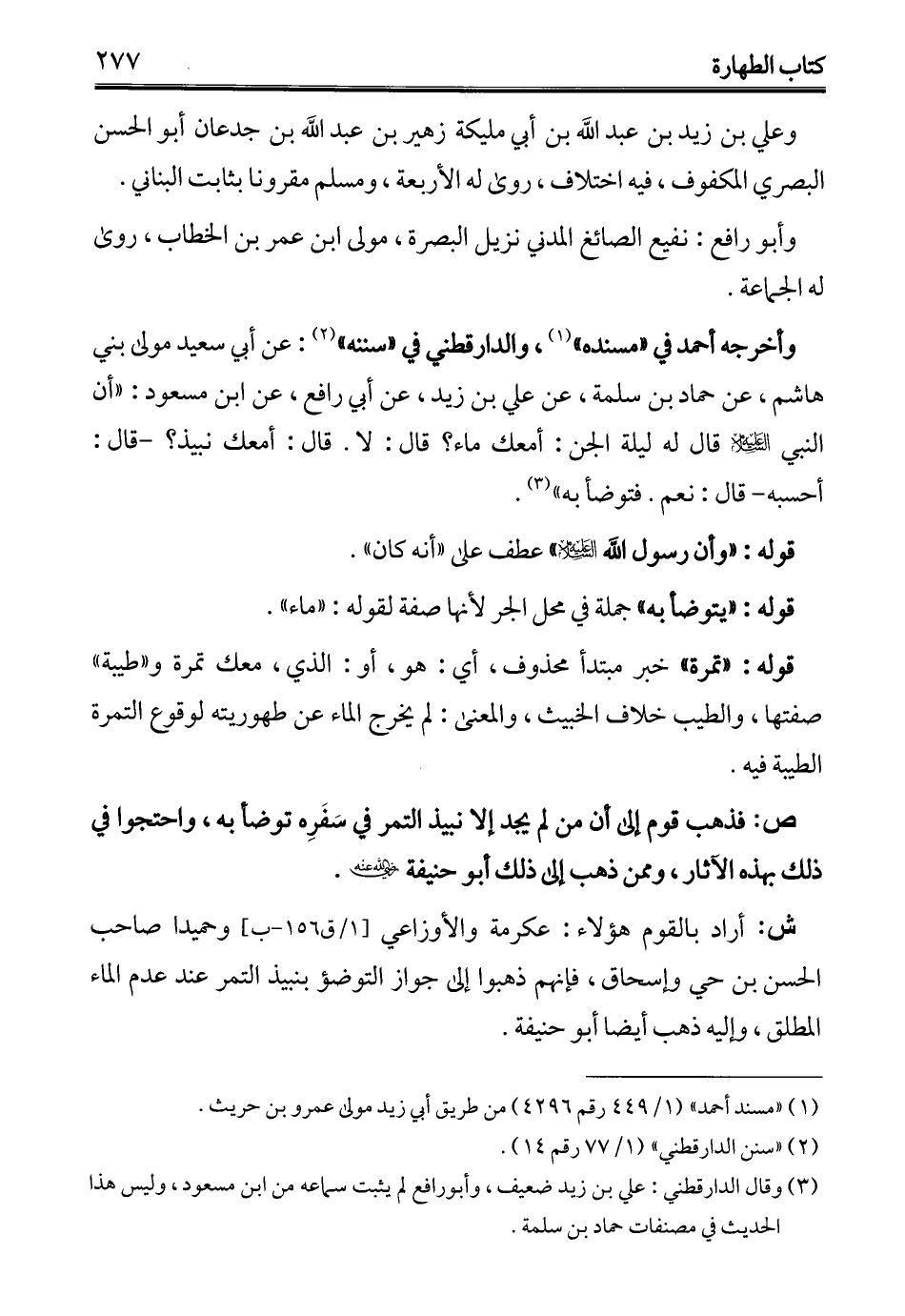 وأخرجه أحمد في "مسنده" (¬1)، والدارقطني في "سننه" (¬2): عن أبي سعيد مولى بني هاشم، عن حماد بن سلمة، عن علي بن زيد، عن أبي رافع، عن ابن مسعود: "أن النبي - عليه السلام - قال له ليلة الجن: أمعك ماء؟ قال: لا. قال: أمعك نبيذ؟ -قال: أحسبه- قال: نعم. فتوضأ به" (¬3).