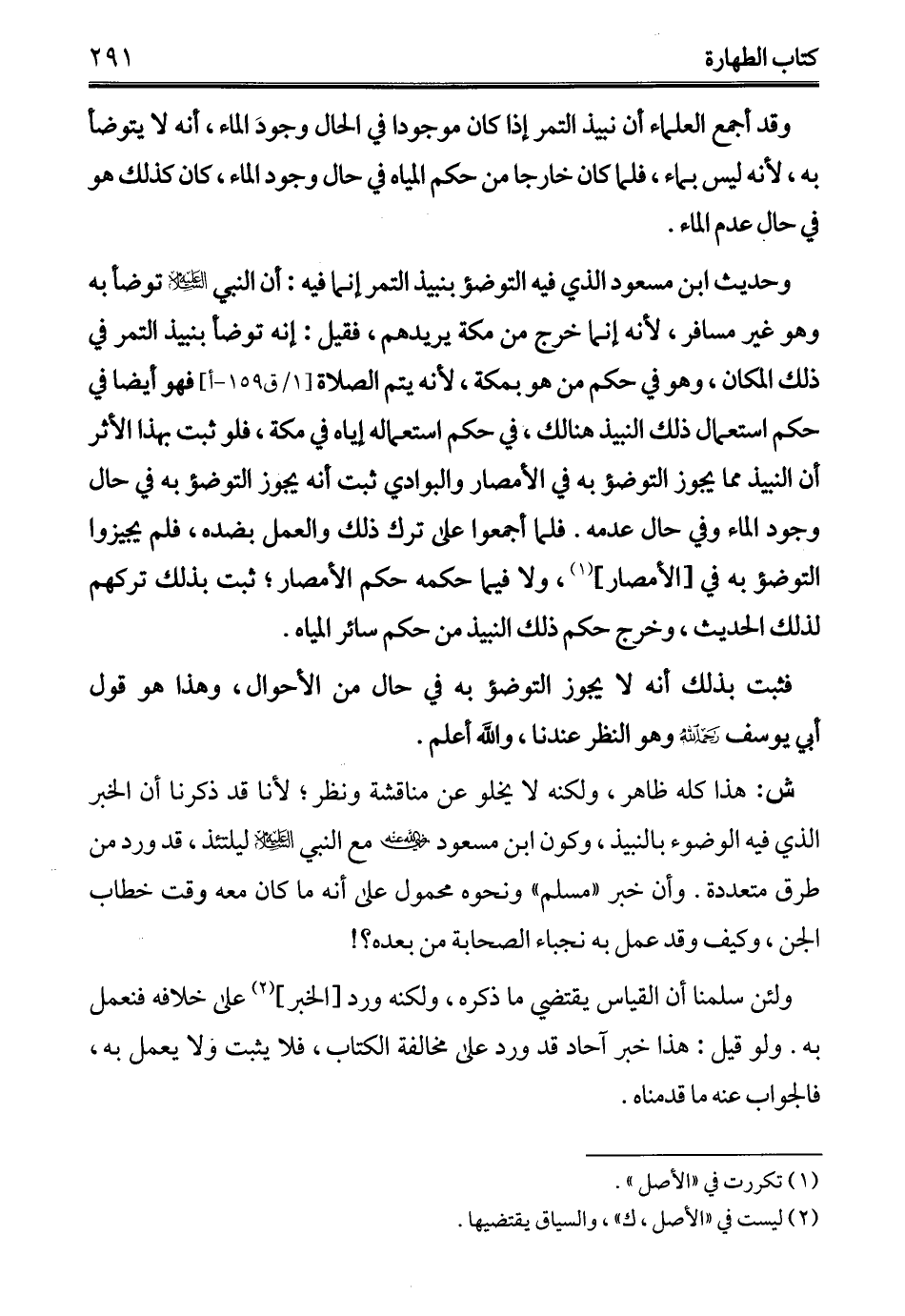 شْ: هذا كله ظاهر، ولكنه لا يخلو عن مناقشة ونظر؛ لأنا قد ذكرنا أن الخبر الذي فيه الوضوء بالنبيذ، وكون ابن مسعود - رضي الله عنه - مع النبي - عليه السلام - ليلتئذ، قد ورد من طرق متعددة. وأن خبر "مسلم" ونحوه محمول على أنه ما كان معه وقت خطاب الجن، وكيف وقد عمل به نجباء الصحابة من بعده؟!