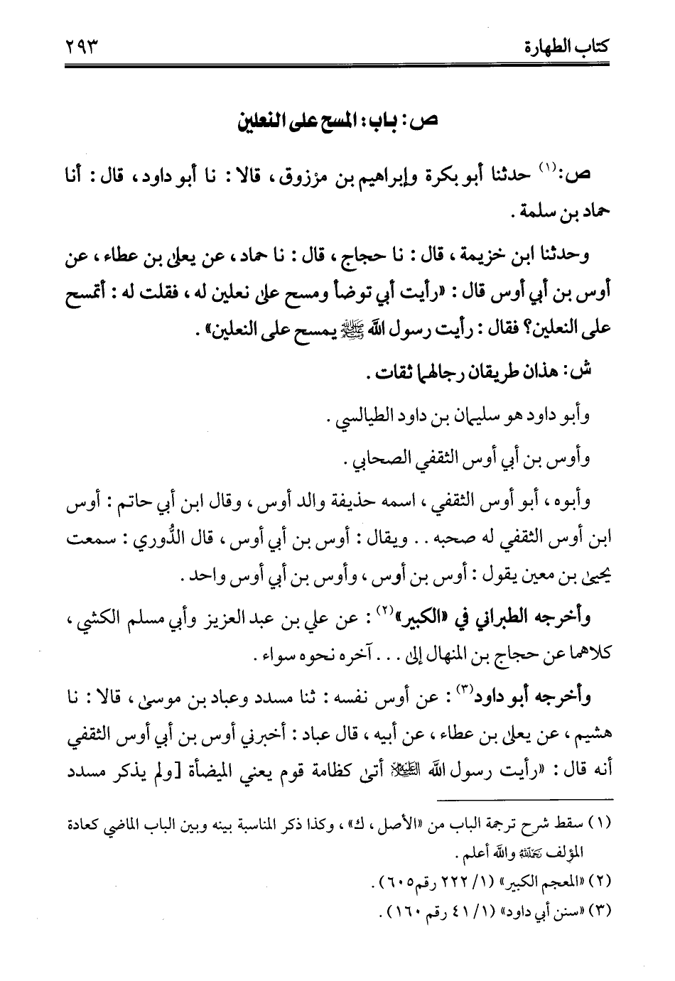 وحدثنا ابن خزيمة، قال: نا حجاج، قال: نا حماد، عن يعلى بن عطاء، عن أوس بن أبي أوس قال: "رأيت أبي توضأ ومسح على نعلين له، فقلت له: أتمسح على النعلين؟ فقال: رأيت رسول الله - صلى الله عليه وسلم - يمسح على النعلين".