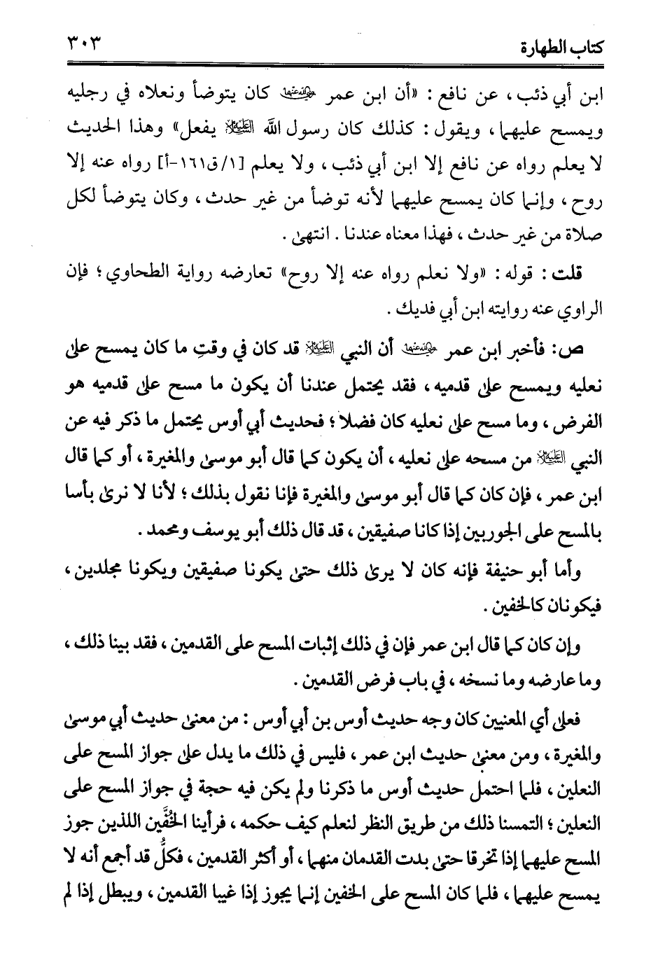 ابن أبي ذئب، عن نافع: "أن ابن عمر - رضي الله عنهما - كان يتوضأ ونعلاه في رجليه ويمسح عليهما، ويقول: كذلك كان رسول الله - عليه السلام - يفعل" وهذا الحديث لا يعلم رواه عن نافع إلا ابن أبي ذئب، ولا يعلم رواه عنه إلا روح، وإنما كان يمسح عليهما لأنه توضأ من غير حدث، وكان يتوضأ لكل صلاة من غير حدث، فهذا معناه عندنا. انتهى.