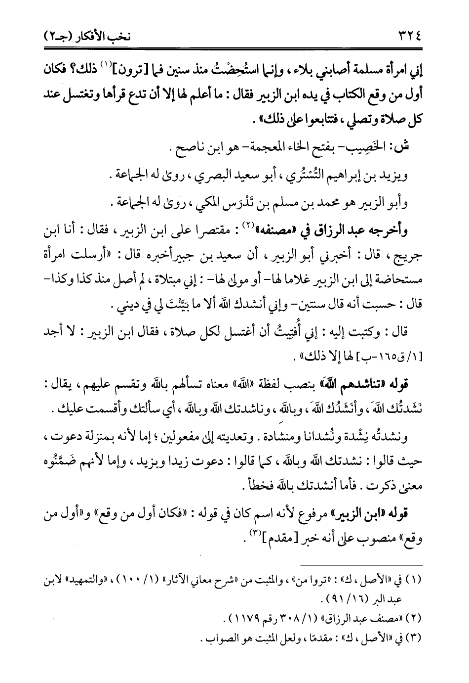 وأخرجه عبد الرزاق في "مصنفه" (¬2): مقتصرا على ابن الزبير، فقال: أنا ابن جريج، قال: أخبرني أبو الزبير، أن سعيد بن جبير أخبره قال: "أرسلت امرأة مستحاضة إلى ابن الزبير غلاما لها -أو مولى لها-: إني مبتلاة، لم أصل منذ كذا وكذا -قال: حسبت أنه قال سنتين- وإني أنشدك الله ألا ما بَيَّنْتَ لي في ديني.