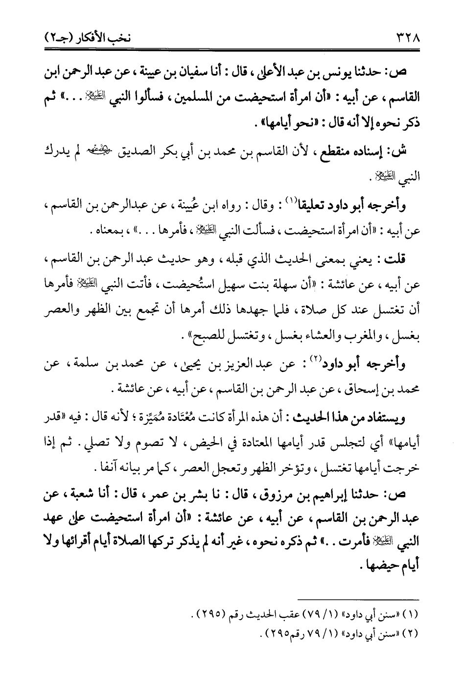 وأخرجه أبو داود تعليقا (¬1): وقال: رواه ابن عُيينة، عن عبد الرحمن بن القاسم، عن أبيه: "أن امرأة استحيضت، فسألت النبي - عليه السلام -، فأمرها ... "، بمعناه.