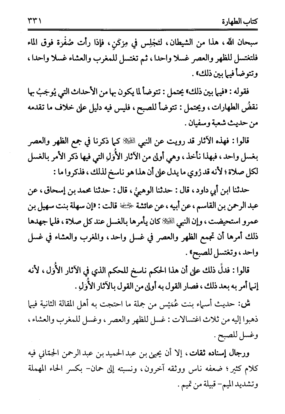 حدثنا ابن أبي داود، قال: حدثنا الوهبي، قال: حدثنا محمَّد بن إسحاق، عن عبد الرحمن بن القاسم، عن أبيه، عن عائشة - رضي الله عنها - قالت: "إن سهلة بنت سهيل بن عمرو استحيضت، وإن النبي - عليه السلام - كان يأمرها بالغسل عند كل صلاة، فلما جهدها ذلك أمرها أن تجمع الظهر والعصر في غسل واحد، والمغرب والعشاء في غسل واحد، وتغتسل للصبح".
