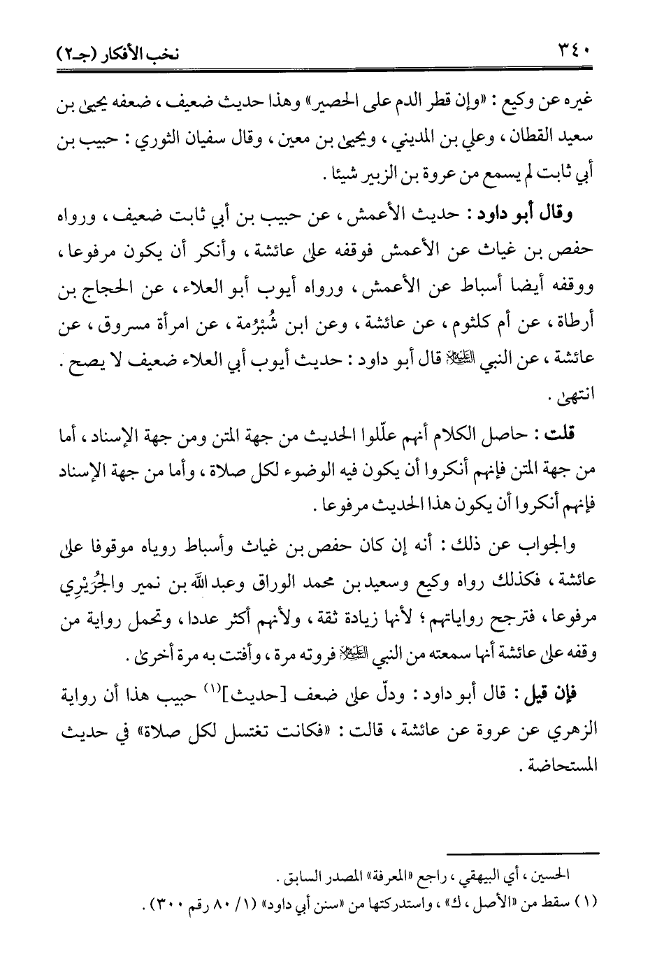 والجواب عن ذلك: أنه إن كان حفص بن غياث وأسباط روياه موقوفا على عائشة، فكذلك رواه وكيع وسعيد بن محمَّد الوراق وعبد الله بن نمير والجُرَيْرِي مرفوعا، فترجح رواياتهم؛ لأنها زيادة ثقة، ولأنهم أكثر عددا، وتحمل رواية من وقفه على عائشة أنها سمعته من النبي - عليه السلام - فروته مرة، وأفتت به مرة أخرى.