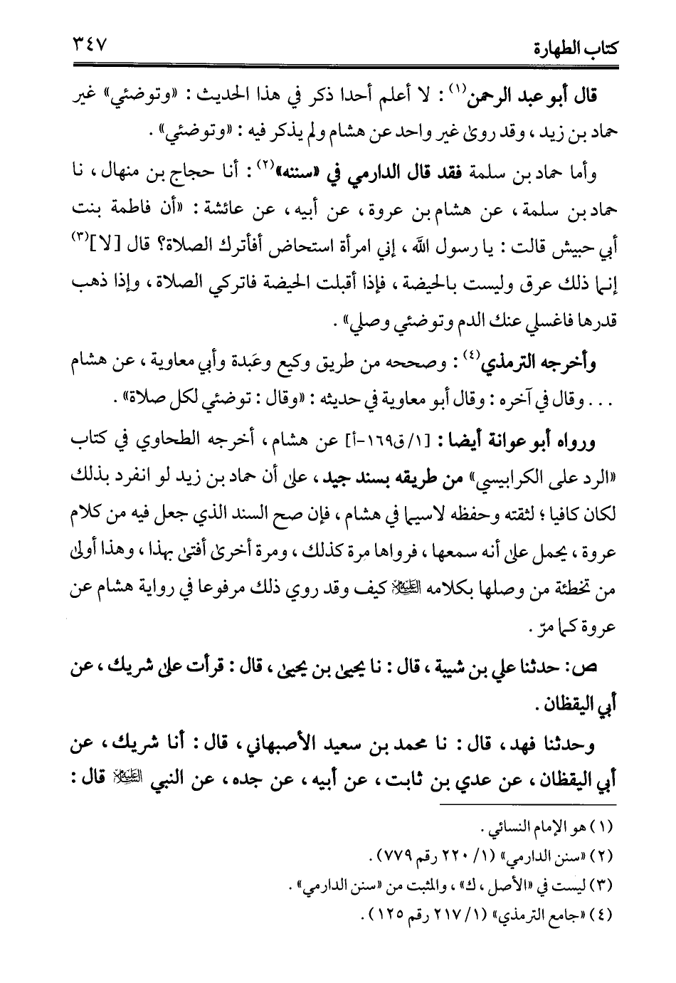 وأما حماد بن سلمة فقد قال الدارمي في "سننه" (¬2): أنا حجاج بن منهال، نا حماد بن سلمة، عن هشام بن عروة، عن أبيه، عن عائشة: "أن فاطمة بنت أبي حبيش قالت: يا رسول الله، إني امرأة استحاض أفأترك الصلاة؟ قال [لا] (¬3) إنما ذلك عرق وليست بالحيضة، فإذا أقبلت الحيضة فاتركي الصلاة، وإذا ذهب قدرها فاغسلي عنك الدم وتوضئي وصلي".