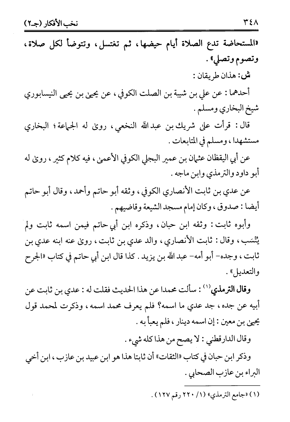 عن عدي بن ثابت الأنصاري الكوفي، وثقه أبو حاتم وأحمد، وقال أبو حاتم أيضا: صدوق، وكان إمام مسجد الشيعة وقاضيهم.