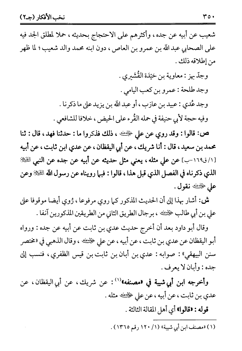 ص: قالوا: وقد روي عن علي - رضي الله عنه -، ذلك فذكروا ما: حدثنا فهد، قال: ثنا محمَّد بن سعيد، قال: أنا شريك، عن أبي اليقظان، عن عدي ابن ثابت، عن أبيه عن علي مثله، يعني مثل حديثه عن أبيه عن جده عن النبي - عليه السلام - الذي ذكرناه في الفصل الذي قبل هذا، قالوا: فبما رويناه عن رسول الله - عليه السلام - وعن علي - رضي الله عنه - نقول.