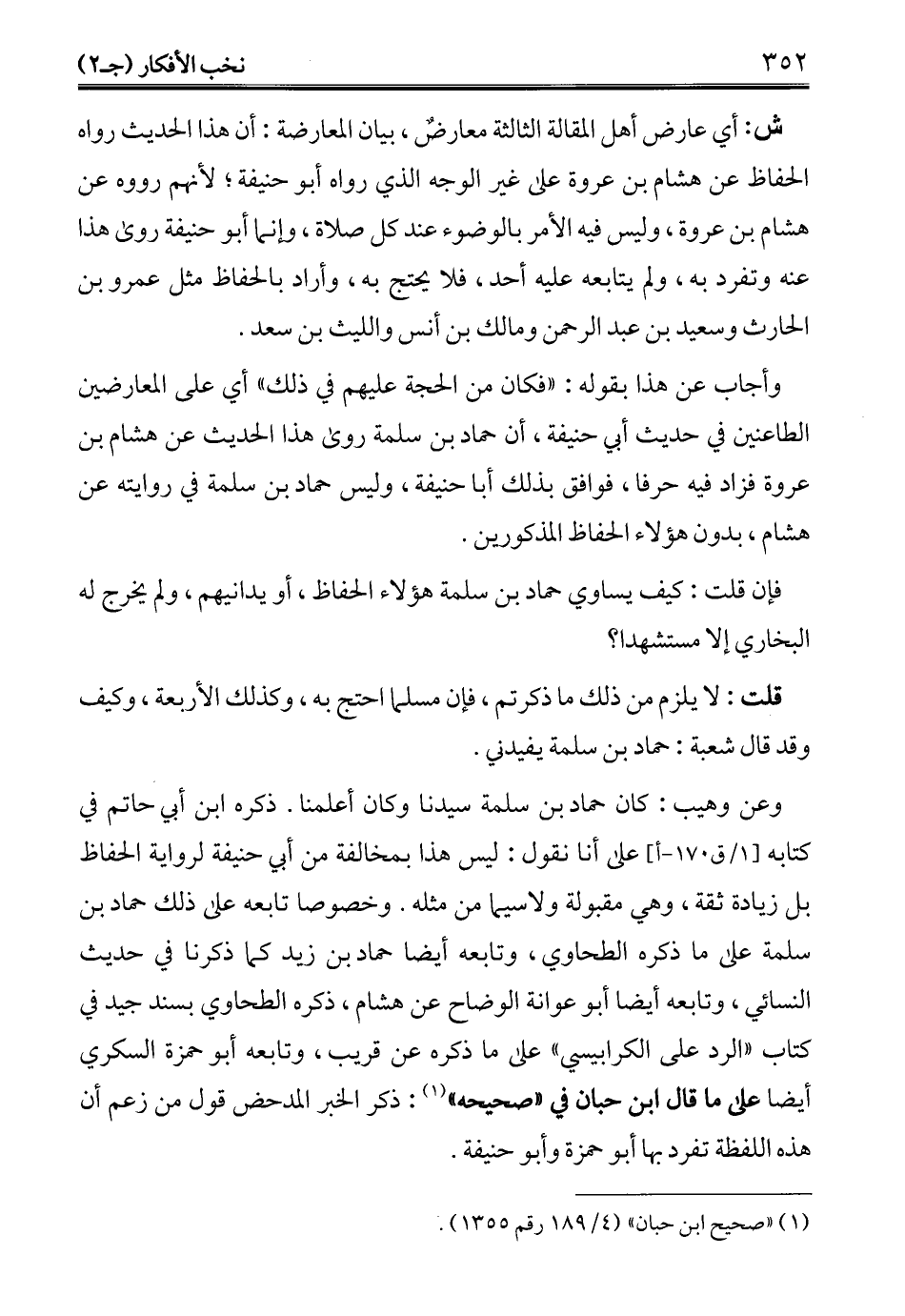 وأجاب عن هذا بقوله: "فكان من الحجة عليهم في ذلك" أي على المعارضين الطاعنين في حديث أبي حنيفة، أن حماد بن سلمة روى هذا الحديث عن هشام بن عروة فزاد فيه حرفا، فوافق بذلك أبا حنيفة، وليس حماد بن سلمة في روايته عن هشام، بدون هؤلاء الحفاظ المذكورين.