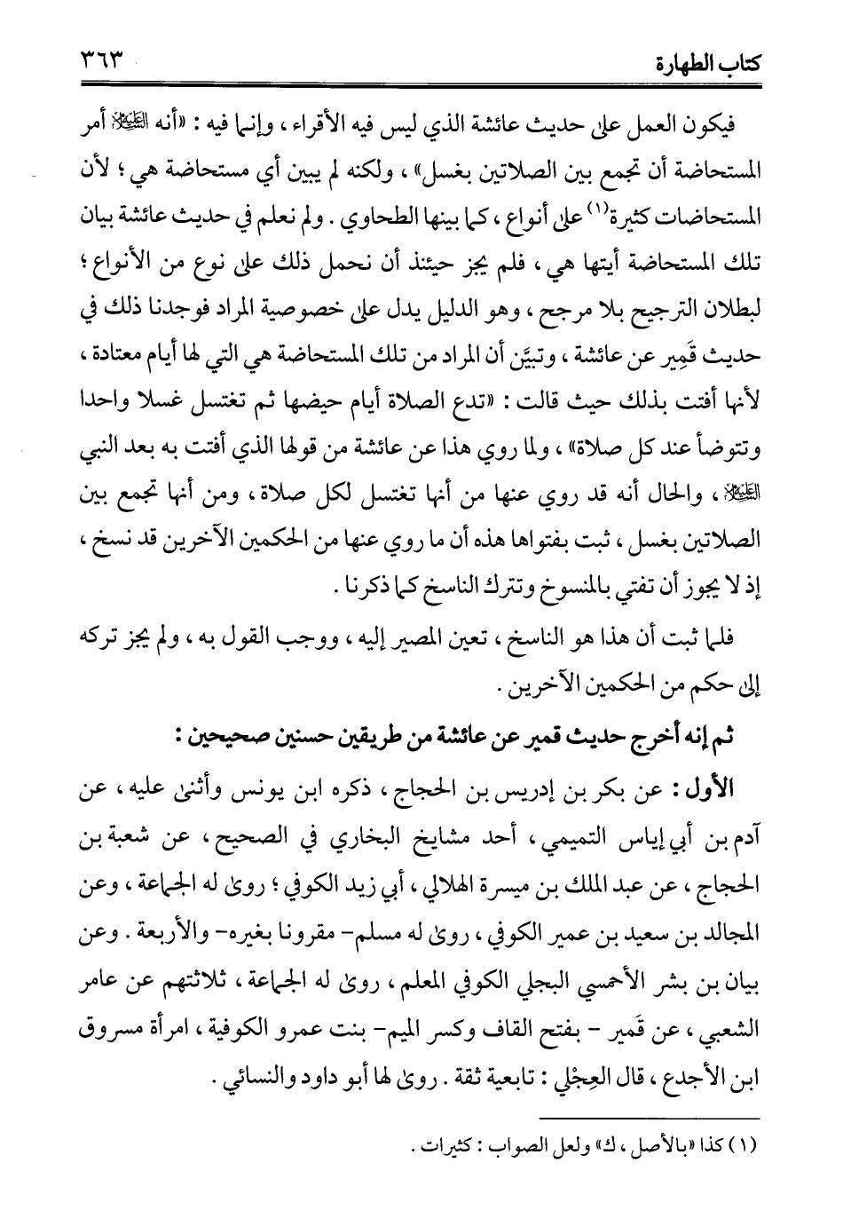 فيكون العمل على حديث عائشة الذي ليس فيه الأقراء، وإنما فيه: "أنه - عليه السلام - أمر المستحاضة أن تجمع بين الصلاتين بغسل"، ولكنه لم يبين أي مستحاضة هي؛ لأن المستحاضات كثيرة (¬1) على أنواع، كما بينها الطحاوي. ولم نعلم في حديث عائشة بيان تلك المستحاضة أيتها هي، فلم يجز حيئنذ أن نحمل ذلك على نوع من الأنواع؛ لبطلان الترجيح بلا مرجح، وهو الدليل يدل على خصوصية المراد فوجدنا ذلك في حديث قَمِير عن عائشة، وتبيَّن أن المراد من تلك المستحاضة هي التي لها أيام معتادة، لأنها أفتت بذلك حيث قالت: "تدع الصلاة أيام حيضها ثم تغتسل غسلا واحدا وتتوضأ عند كل صلاة", ولما روي هذا عن عائشة من قولها الذي أفتت به بعد النبي - عليه السلام -، والحال أنه قد روي عنها من أنها تغتسل لكل صلاة، ومن أنها تجمع بين الصلاتين بغسل، ثبت بفتواها هذه أن ما روي عنها من الحكمين الآخرين قد نسخ، إذ لا يجوز أن تفتي بالمنسوخ وتترك الناسخ كما ذكرنا.