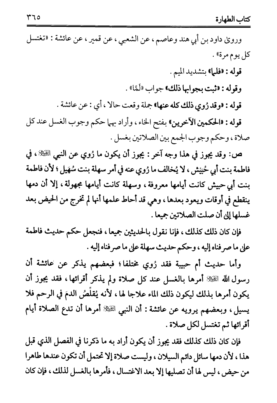ص: وقد يجوز في هذا وجه آخر: يجوز أن يكون ما رُوي عن النبي - عليه السلام -، في فاطمة بنت أبي حُبَيْش، لا يُخالف ما رُوي عنه في أمر سهلة بنت سُهَيل؛ لأن فاطمة بنت أبي حبيش كانت أيامها معروفة، وسهلة كانت أيامها مجهولة، إلا أن دمها ينقطع في أوقات ويعود بعدها، وهي قد أحاط علمها أنها لم تخرج من الحيض بعد غسلها إلى أن صلت الصلاتين جميعا.