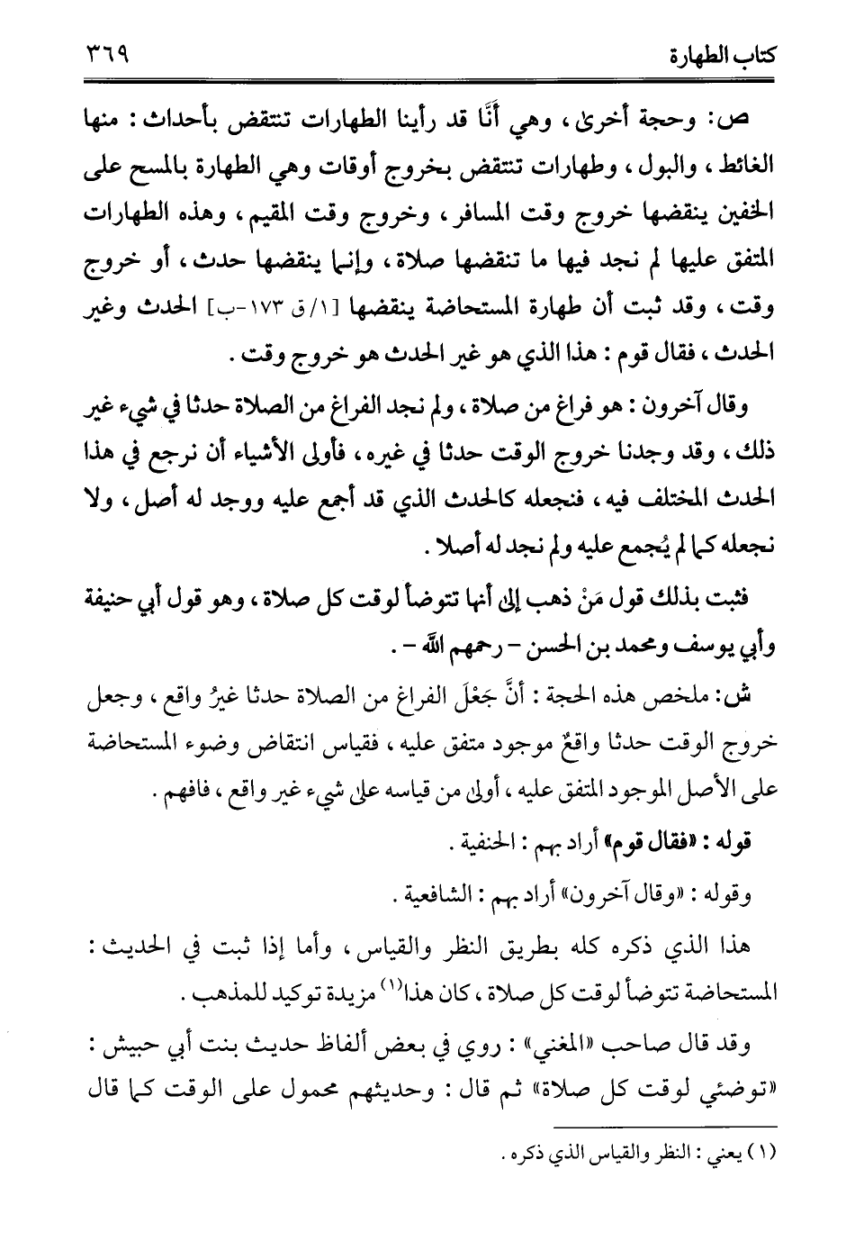 ش: ملخص هذه الحجة: أنَّ جَعْلَ الفراغ من الصلاة حدثا غيرُ واقع، وجعل خروج الوقت حدثا واقعٌ موجود متفق عليه، فقياس انتقاض وضوء المستحاضة على الأصل الموجود المتفق عليه، أصلى من قياسه على شيء غير واقع، فافهم.