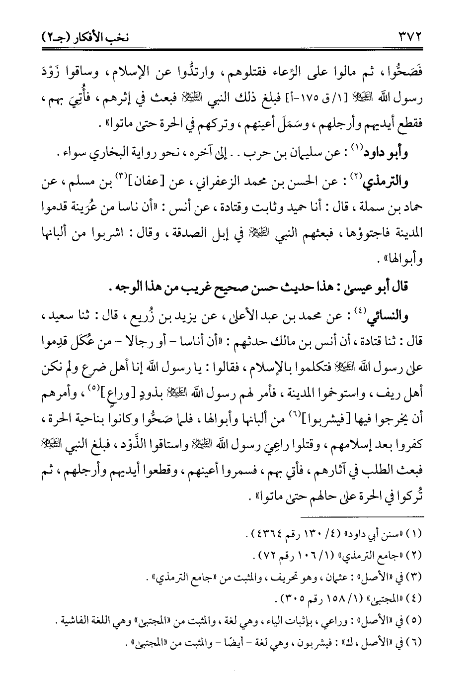 والترمذى (¬2): عن الحسن بن محمَّد الزعفراني، عن [عفان] (¬3) بن مسلم، عن حماد بن سملة، قال: أنا حميد وثابت وقتادة، عن أنس: "أن ناسا من عُرَينة قدموا المدينة فاجتووْها، فبعثهم النبي - عليه السلام - في إبل الصدقة، وقال: اشربوا من ألبانها وأبوالها".