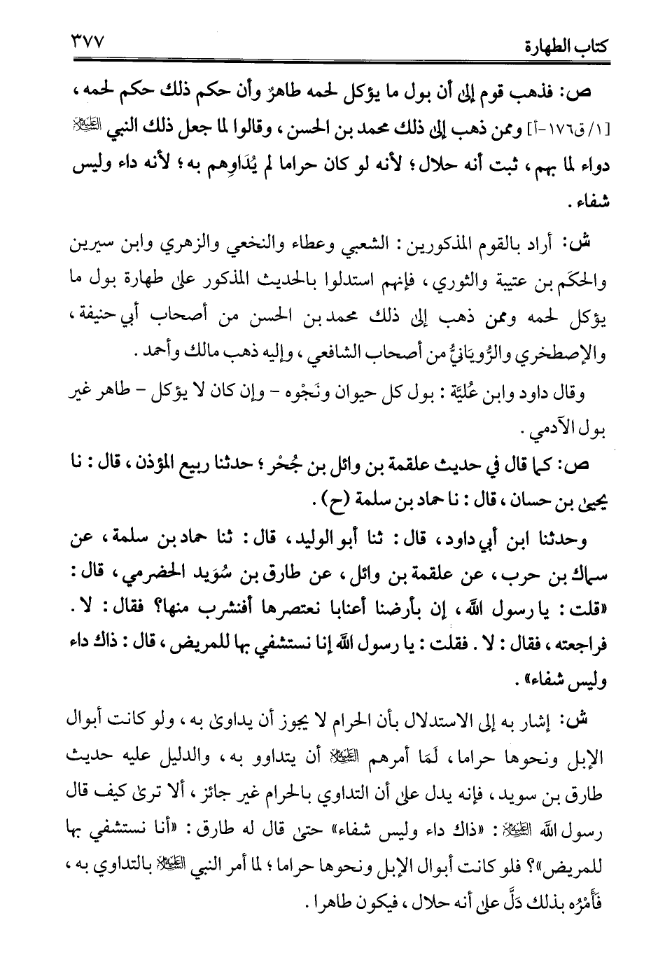 ص: فذهب قوم إلى أن بول ما يؤكل لحمه طاهرٌ وأن حكم ذلك حكم لحمه، وممن ذهب إلى ذلك محمَّد بن الحسن، وقالوا لما جعل ذلك النبي - عليه السلام - دواء لما بهم، ثبت أنه حلال؛ لأنه لو كان حراما لم يُدَاوِهم به؛ لأنه داء وليس شفاء.
