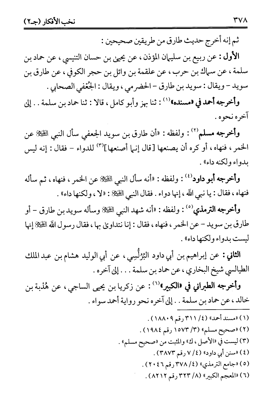 الأول: عن ربيع بن سليمان المؤذن، عن يحيى بن حسان التنيسي، عن حماد بن سلمة، عن سماك بن حرب، عن علقمة بن وائل بن حجر الكوفي، عن طارق بن سويد -ويقال: سويد بن طارق- الحضرمي، ويقال: الجُعْفي الصحابي.