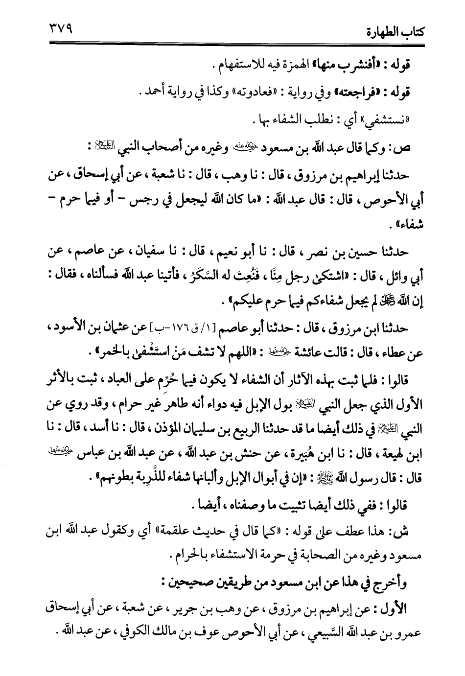 ش: هذا عطف على قوله: "كما قال في حديث علقمة" أي وكقول عبد الله ابن مسعود وغيره من الصحابة في حرمة الاستشفاء بالحرام.