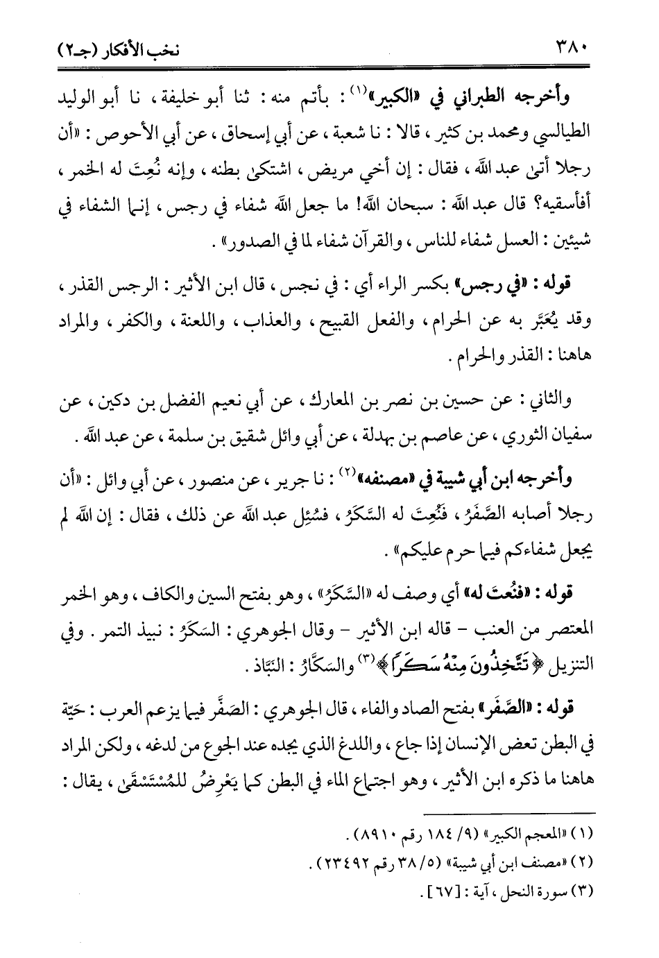 وأخرجه الطبراني في "الكبير" (¬1): بأتم منه: ثنا أبو خليفة، نا أبو الوليد الطيالسي ومحمد بن كثير، قالا: نا شعبة، عن أبي إسحاق، عن أبي الأحوص: "أن رجلا أتى عبد الله، فقال: إن أخي مريض، اشتكى بطنه، وإنه نُعِتَ له الخمر، أفأسقيه؟ قال عبد الله: سبحان الله! ما جعل الله شفاء في رجس، إنما الشفاء في شيئين: العسل شفاء للناس، والقرآن شفاء لما في الصدور".