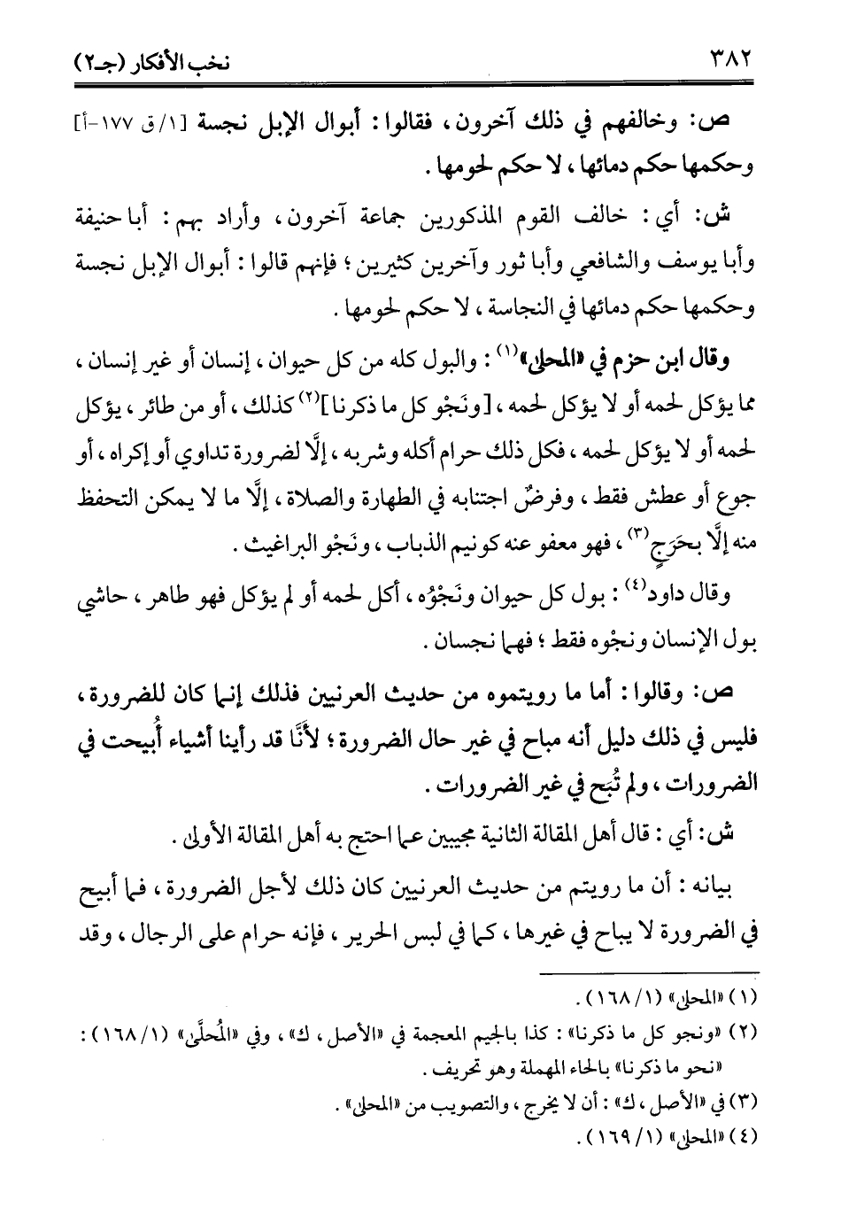 ش: أي: خالف القوم المذكورين جماعة آخرون، وأراد بهم: أبا حنيفة وأبا يوسف والشافعي وأبا ثور وآخرين كثيرين؛ فإنهم قالوا: أبوال الإبل نجسة وحكمها حكم دمائها في النجاسة، لا حكم لحومها.