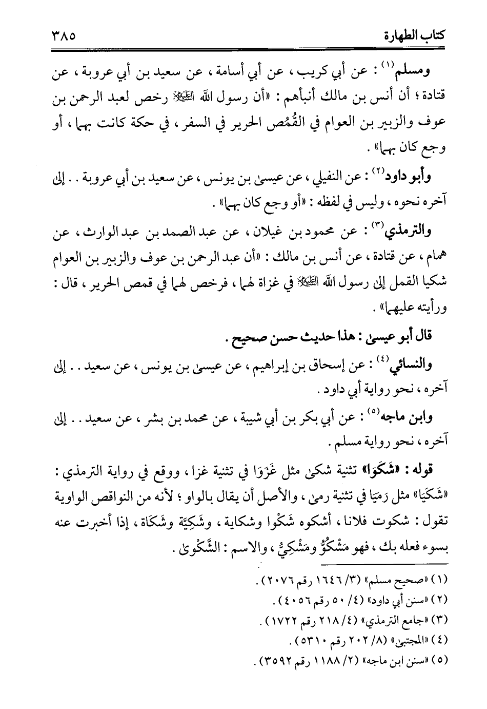 والترمذي (¬3): عن محمود بن غيلان، عن عبد الصمد بن عبد الوارث، عن همام، عن قتادة، عن أنس بن مالك: "أن عبد الرحمن بن عوف والزبير بن العوام شكيا القمل إلى رسول الله - عليه السلام - في غزاة لهما، فرخص لهما في قمص الحرير، قال: ورأيته عليهما".