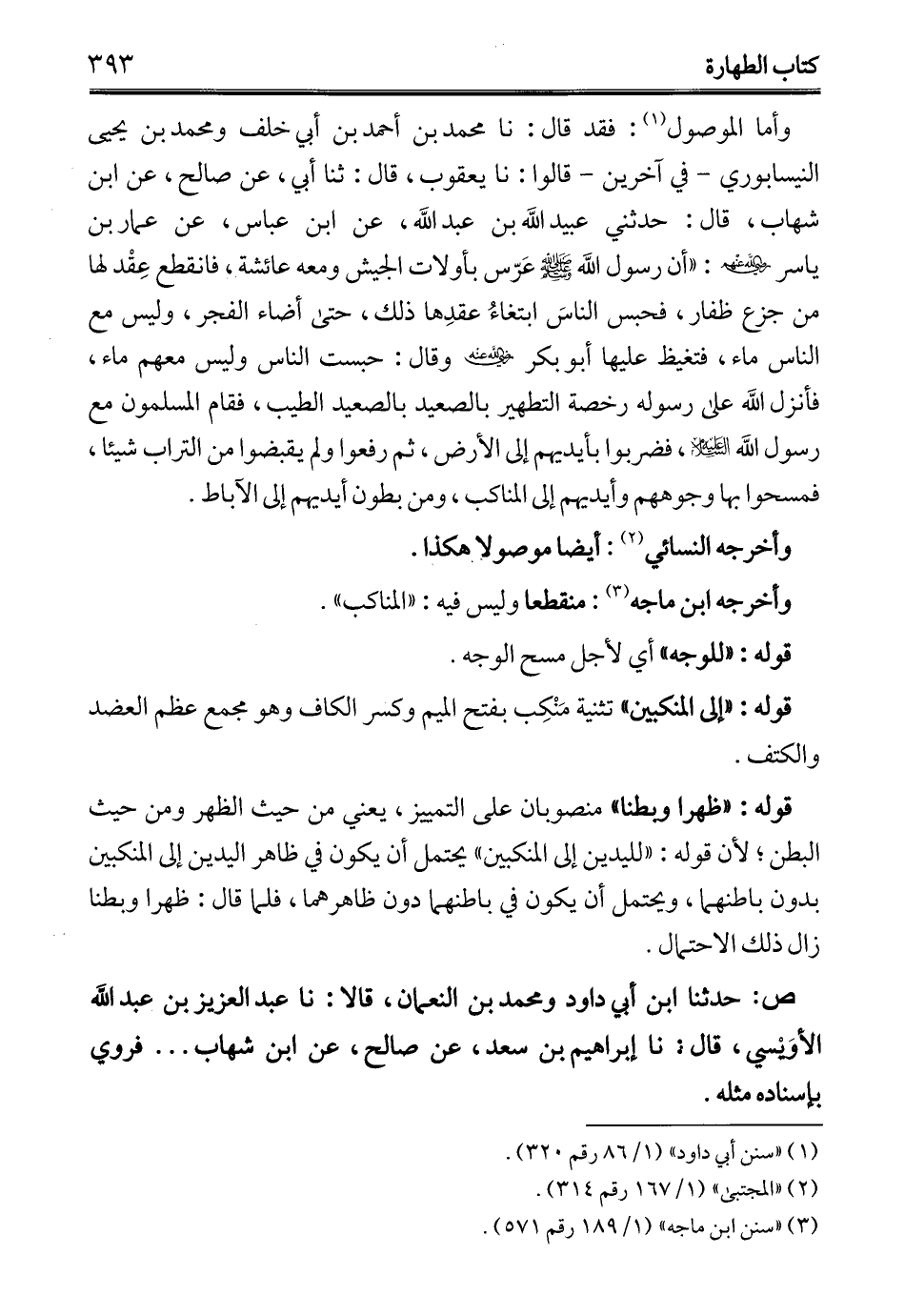 وأما الموصول (¬1): فقد قال: نا محمد بن أحمد بن أبي خلف ومحمد بن يحيى النيسابوري -في آخرين- قالوا: نا يعقوب، قال: ثنا أبي، عن صالح، عن ابن شهاب، قال: حدثني عبيد الله بن عبد الله، عن ابن عباس، عن عمار بن ياسر - رضي الله عنهم -: "أن رسول الله - صلى الله عليه وسلم - عَرّس بأولات الجيش ومعه عائشة، فانقطع عِقْد لها من جزع ظفار، فحبس الناسَ ابتغاءُ عقدِها ذلك، حتى أضاء الفجر، وليس مع الناس ماء، فتغيظ عليها أبو بكر - رضي الله عنه - وقال: حبست الناس وليس معهم ماء، فأنزل الله على رسوله رخصة التطهير بالصعيد بالصعيد الطيب، فقام المسلمون مع رسول الله - عليه السلام -، فضربوا بأيديهم إلى الأرض، ثم رفعوا ولم يقبضوا من التراب شيئا، فمسحوا بها وجوههم وأيديهم إلى المناكب، ومن بطون أيديهم إلى الآباط.