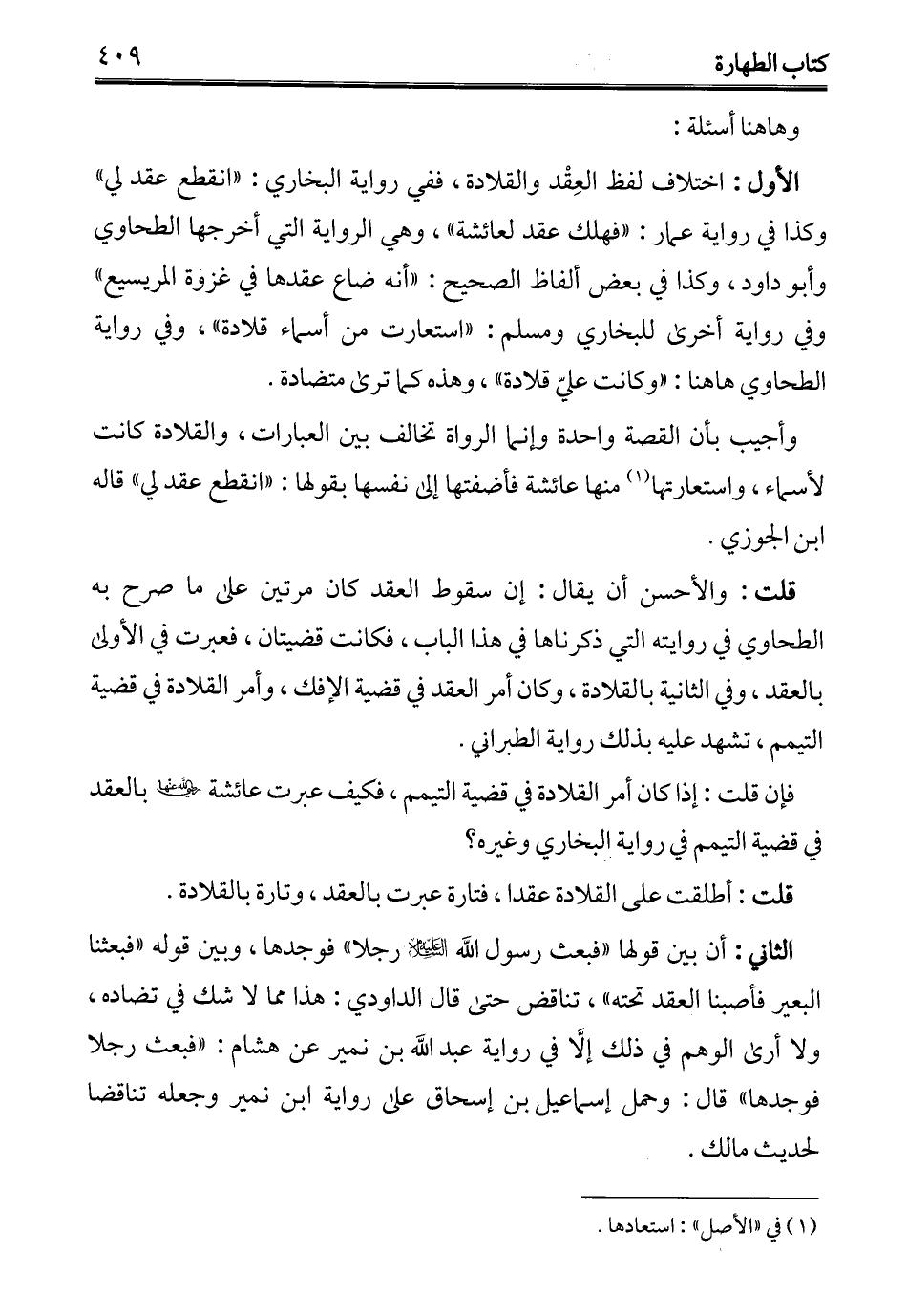 الأول: اختلاف لفظ العِقْد والقلادة، ففي رواية البخاري: "انقطع عقد لي" وكذا في رواية عمار: "فهلك عقد لعائشة"، وهي الرواية التي أخرجها الطحاوي وأبو داود، وكذا في بعض ألفاظ الصحيح: "أنه ضاع عقدها في غزوة المريسيع" وفي رواية أخرى للبخاري ومسلم: "استعارت من أسماء قلادة"، وفي رواية الطحاوي ها هنا: "وكانت عليّ قلادة"، وهذه كما ترى متضادة.
