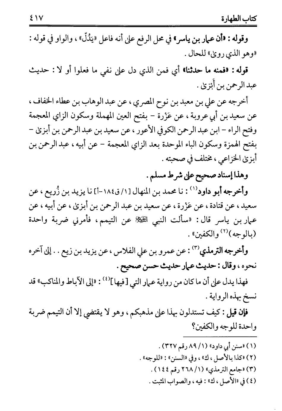 وأخرجه أبو داود (¬1): نا محمَّد بن المنهال نا يزيد بن زُريع، عن سعيد، عن قتادة، عن عَزْرة، عن سعيد بن عبد الرحمن بن أبزى، عن أبيه، عن عمار بن ياسر قال: "سألت النبي - عليه السلام - عن التيمم، فأمرني ضربة واحدة (بالوجه) (¬2) والكفين".