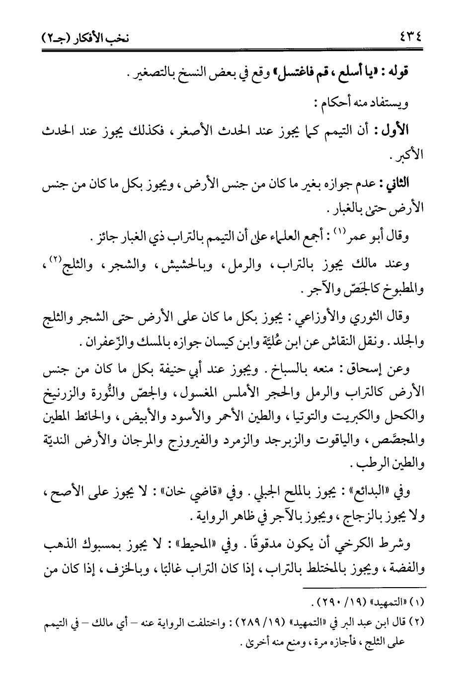 (¬2) قال ابن عبد البر في "التمهيد" (19/ 289): واختلفت الرواية عنه -أي مالك- في التيمم على الثلج، فأجازه مرة، ومنع منه أخرى.