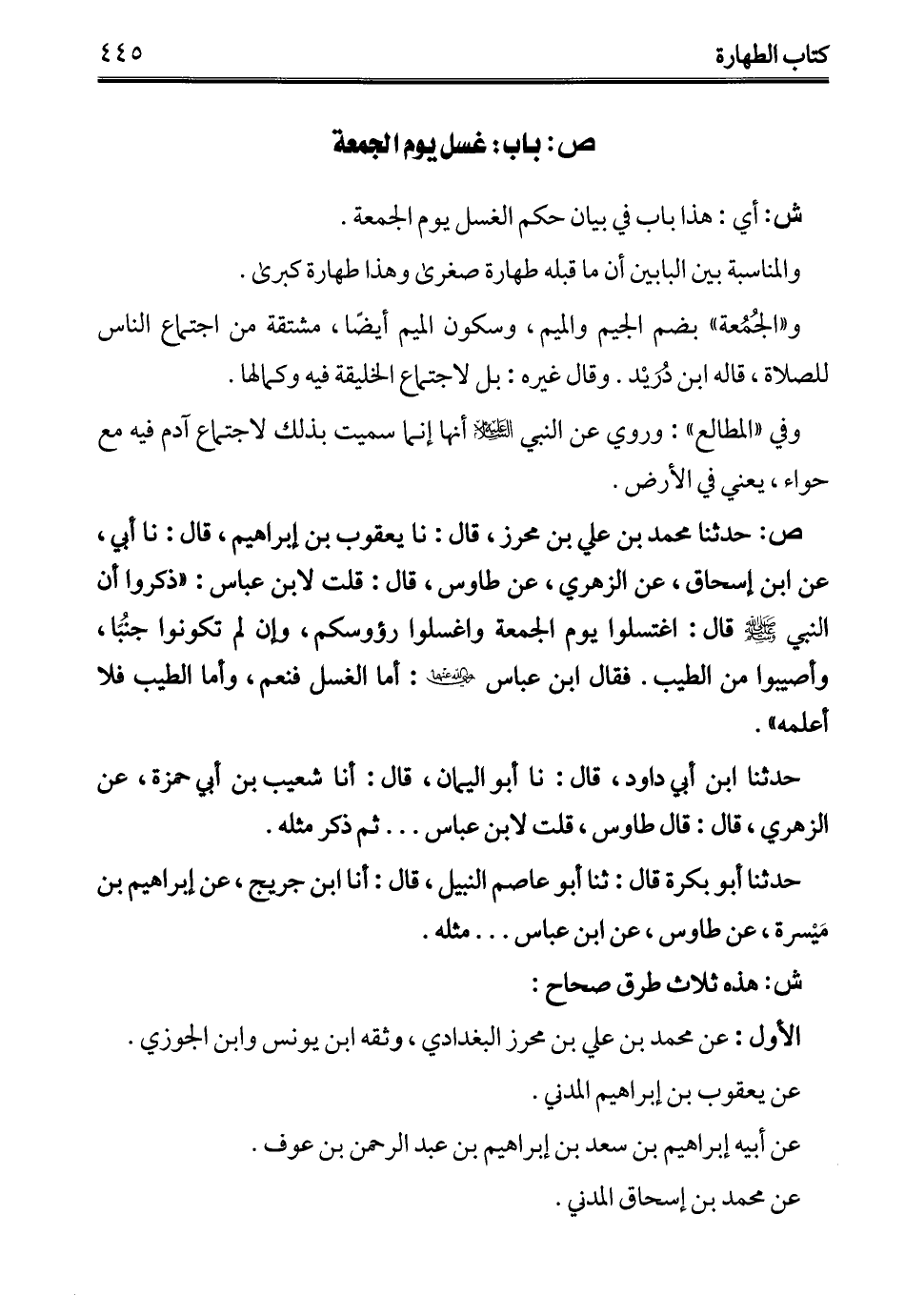 ص: حدثنا محمَّد بن علي بن محرز، قال: نا يعقوب بن إبراهيم، قال: نا أبي، عن ابن إسحاق، عن الزهري، عن طاوس، قال: قلت لابن عباس: "ذكروا أن النبي - عليه السلام - قال: اغتسلوا يوم الجمعة واغسلوا رؤوسكم، وإن لم تكونوا جنُبَا، وأصيبوا من الطيب. فقال ابن عباس - رضي الله عنهما -: أما الغسل فنعم، وأما الطيب فلا أعلمه".