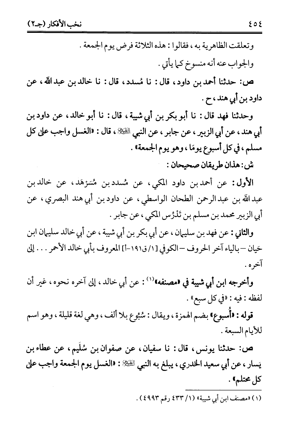 وحدثنا فهد قال: نا أبو بكر بن أبي شيبة، قال: نا أبو خالد، عن داود بن أبي هند، عن أبى الزبير، عن جابر، عن النبي - عليه السلام -، قال: "الغسل واجب على كل مسلم، في كل أسبوع يومًا، وهو يوم الجمعة".