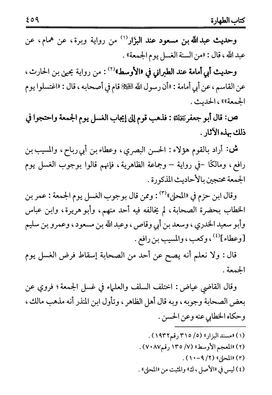 وقال ابن حزم في "المحلى" (¬3): وممن قال بوجوب الغسل يوم الجمعة: عمر بن الخطاب بحضرة الصحابة، لم يخالفه فيه أحد منهم، وأبو هريرة، وابن عباس وأبو سعيد الخدري، وسعد بن أبي وقاص، وعبد الله بن مسعود، وعمرو بن سليم [وعطاء] (¬4)، وكعب، والمسيب بن رافع.