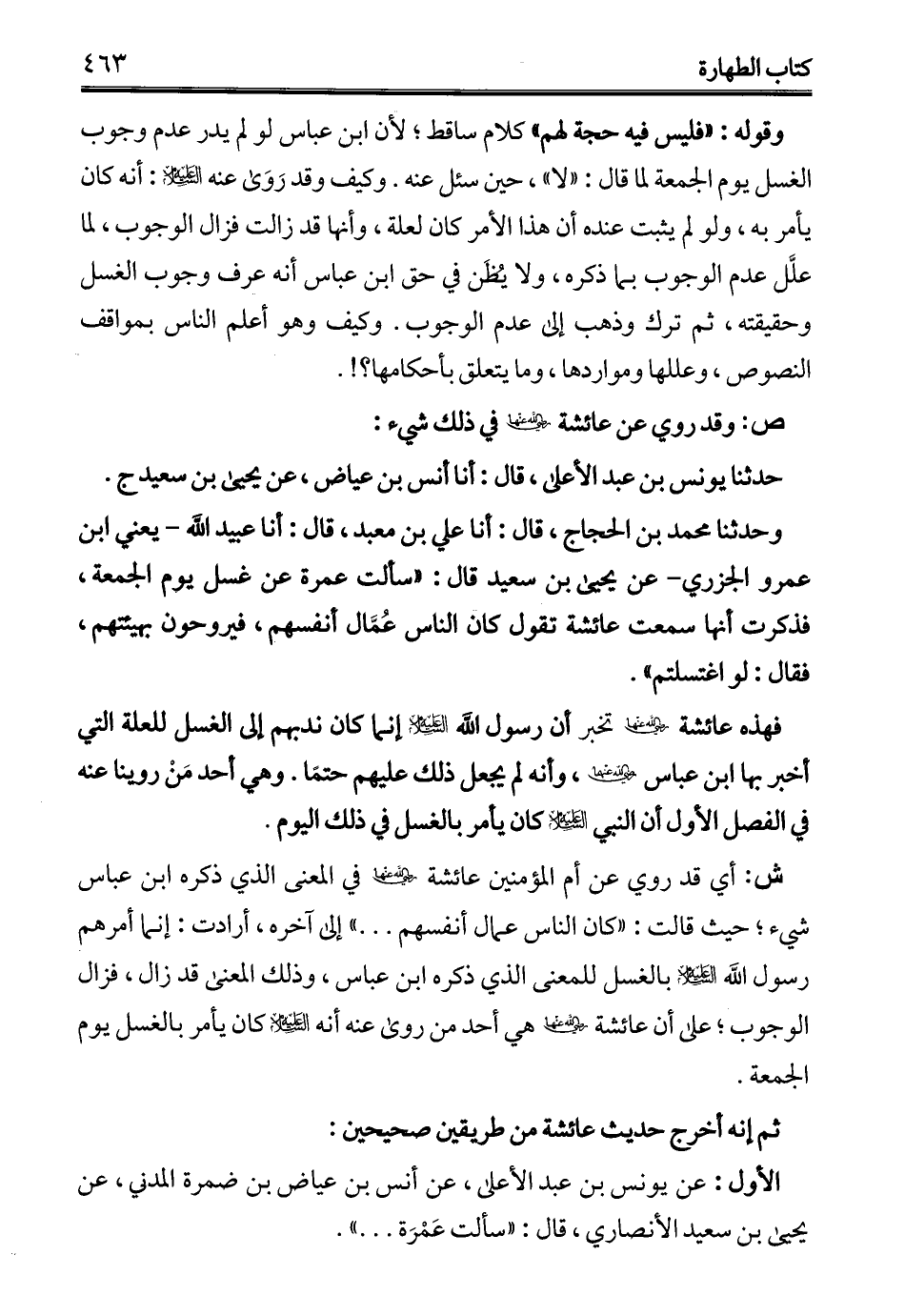 وحدثنا محمَّد بن الحجاج، قال: أنا علي بن معبد، قال: أنا عبيد الله -يعني ابن عمرو الجزري- عن يحيي بن سعيد قال: "سألت عمرة عن غسل يوم الجمعة، فذكرت أنها سمعت عائشة تقول كان الناس عُمَّال أنفسهم، فيروحون بهيئتهم، فقال: لو اغتسلتم".