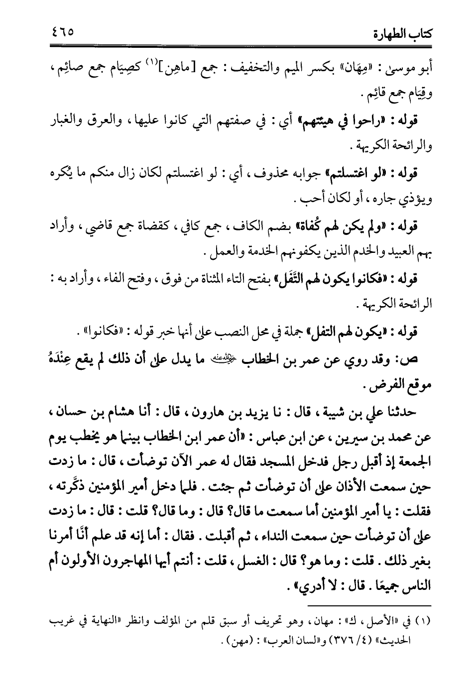 حدثنا علي بن شيبة، قال: نا يزيد بن هارون، قال: أنا هشام بن حسان، عن محمَّد بن سيرين، عن ابن عباس: "أن عمر ابن الخطاب بينما هو يخطب يوم الجمعة إذ أقبل رجل فدخل المسجد فقال له عمر الآن توضأت، قال: ما زدت حين سمعت الأذان على أن توضأت ثم جئت. فلما دخل أمير المؤمنين ذكَّرته، فقلت: يا أمير المؤمنين أما سمعمت ما قال؟ قال: وما قال؟ قلت: قال: ما زدت على أن توضأت حين سمعت النداء، ثم أقبلت. فقال: أما إنه قد علم أنَّا أمرنا بغير ذلك. قلت: وما هو؟ قال: الغسل، قلت: أنتم أيها المهاجرون الأولون أم الناس جميعًا. قال: لا أدري".