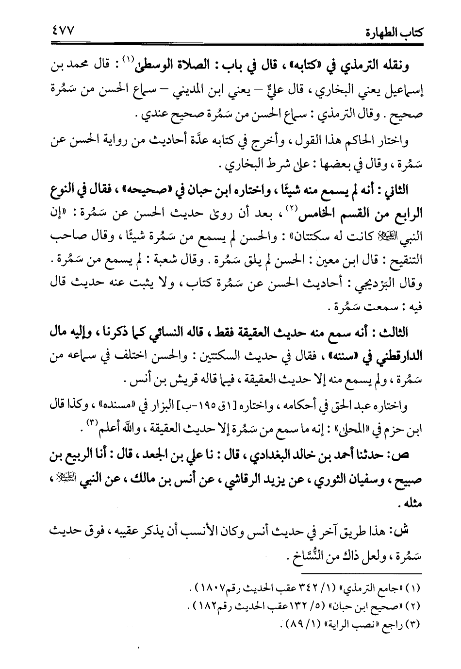 الثالث: أنه سمع منه حديث العقيقة فقط، قاله النسائي كما ذكرنا، وإليه مال الدارقطنى في "سننه"، فقال في حديث السكتتين: والحسن اختلف في سماعه من سَمُرة، ولم يسمع منه إلا حديث العقيقة، فيما قاله قريش بن أنس.