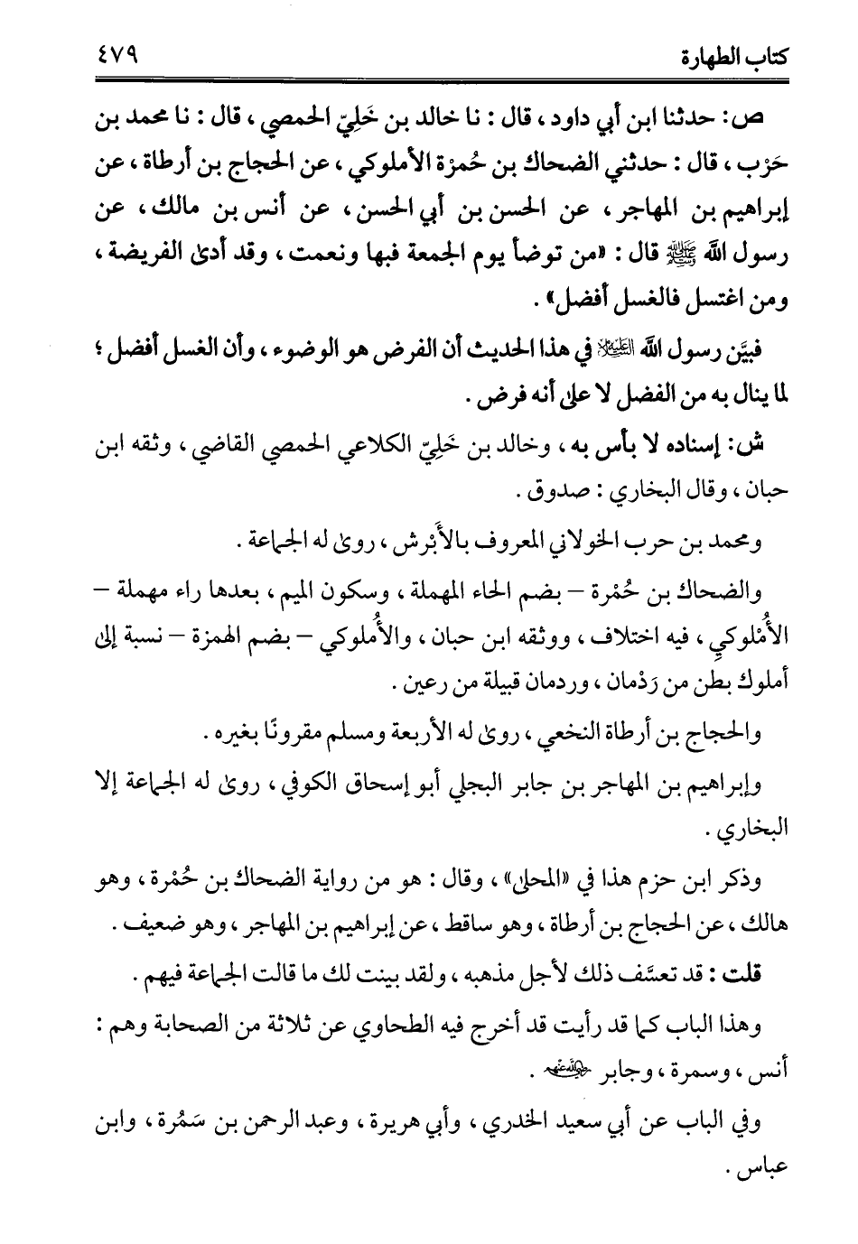 ص: حدثنا ابن أبى داود، قال: نا خالد بن خَلِيّ الحمصي، قال: نا محمَّد بن حَرْب، قال: حدثني الضحاك بن حُمزة الأملوكي، عن الحجاج بن أرطاة، عن إبراهيم بن المهاجر، عن الحسن بن أبي الحسن، عن أنس بن مالك، عن رسول الله - عليه السلام - قال: "من توضأ يوم الجمعة فبها ونعمت، وقد أدى الفريضة، ومن اغتسل فالغسل أفضل".