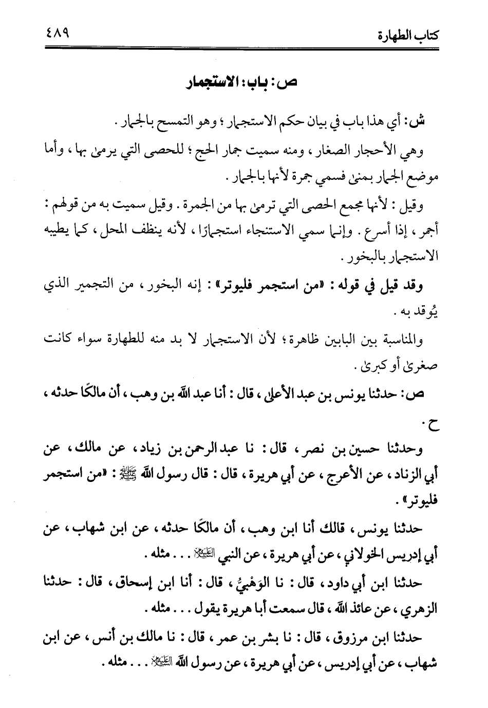 وحدثنا حسين بن نصر، قال: نا عبد الرحمن بن زياد، عن مالك، عن أبي الزناد، عن الأعرج، عن أبي هريرة، قال: قال رسول الله - عليه السلام -: "من استجمر فليوتر".