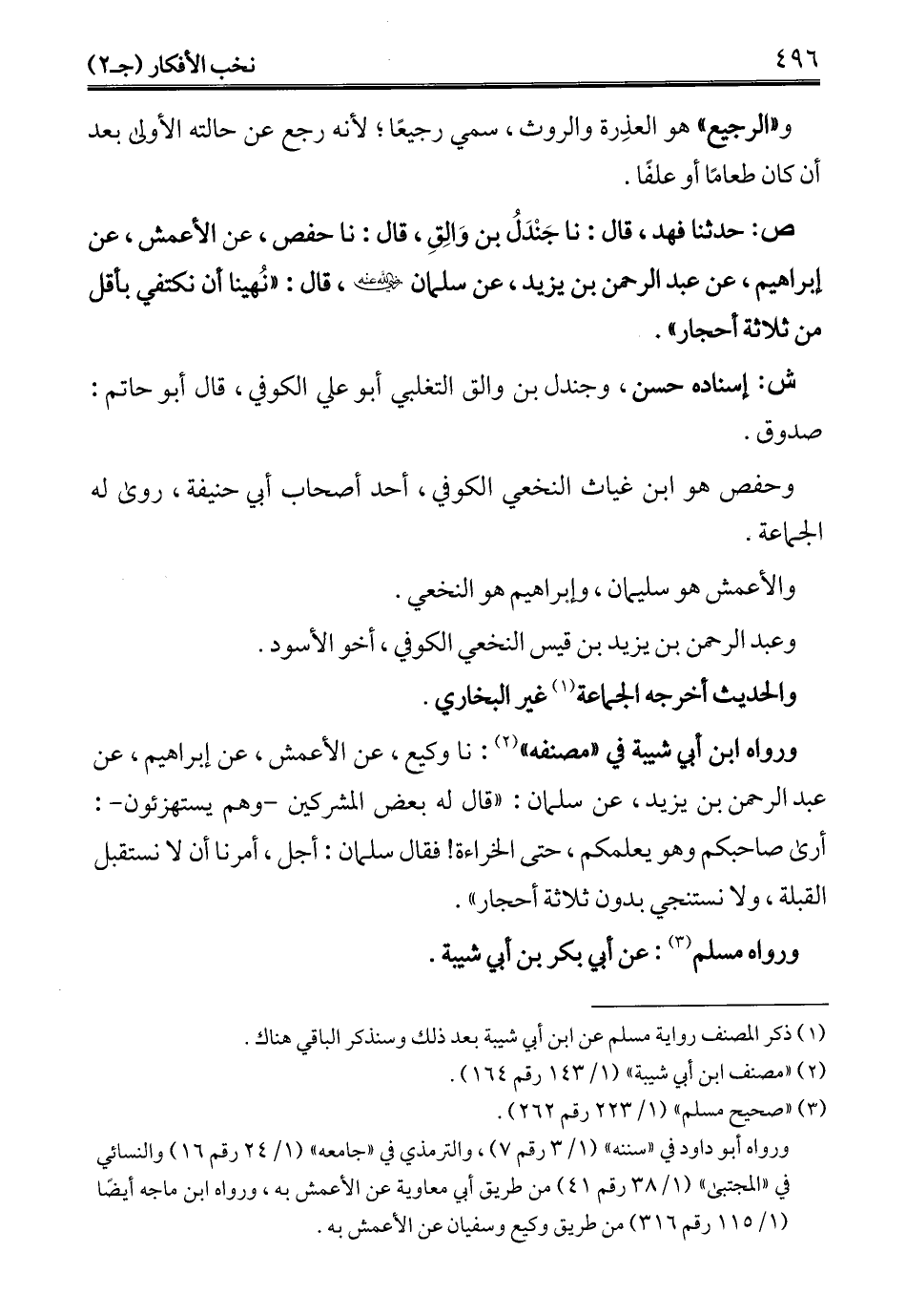 ص: حدثنا فهد، قال: نا جَنْدَلُ بن وَالِقِ، قال: نا حفص، عن الأعمش، عن إبراهيم، عن عبد الرحمن بن يزيد، عن سلمان - رضي الله عنه -، قال: "نُهينا أن نكتفي بأقل من ثلاثة أحجار".