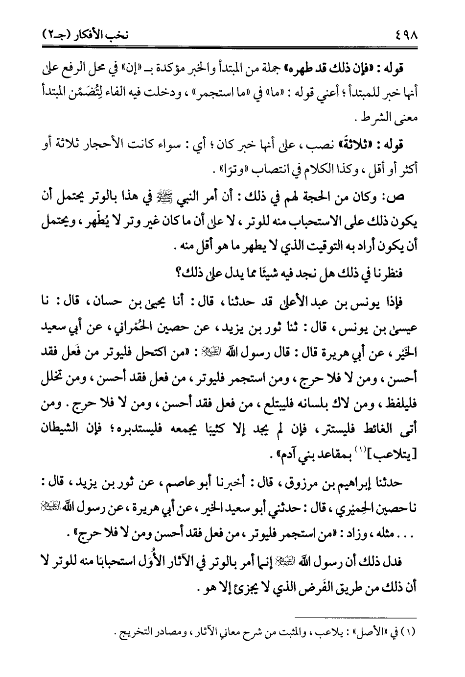 فإذا يونس بن عبد الأعلى قد حدثنا، قال: أنا يحيى بن حسان، قال: نا عيسى بن يونس، قال: ثنا ثور بن يزيد، عن حصين الحُمْراني، عن أبي سعيد الخَيْر، عن أبي هريرة قال: قال رسول الله - عليه السلام -: "من اكتحل فليوتر من فَعل فقد أحسن، ومن لا فلا حرج، ومن استجمر فليوتر، من فعل فقد أحسن، ومن تخلل فليلفظ، ومن لاك بلسانه فليبلع، من فعل فقد أحسن، ومن لا فلا حرج. ومن أتى الغائط فليستتر، فإن لم يجد إلا كثيبًا يجمعه فليستدبره؛ فإن الشيطان [يتلاعب]، (¬1) بمقاعد بني آدم".