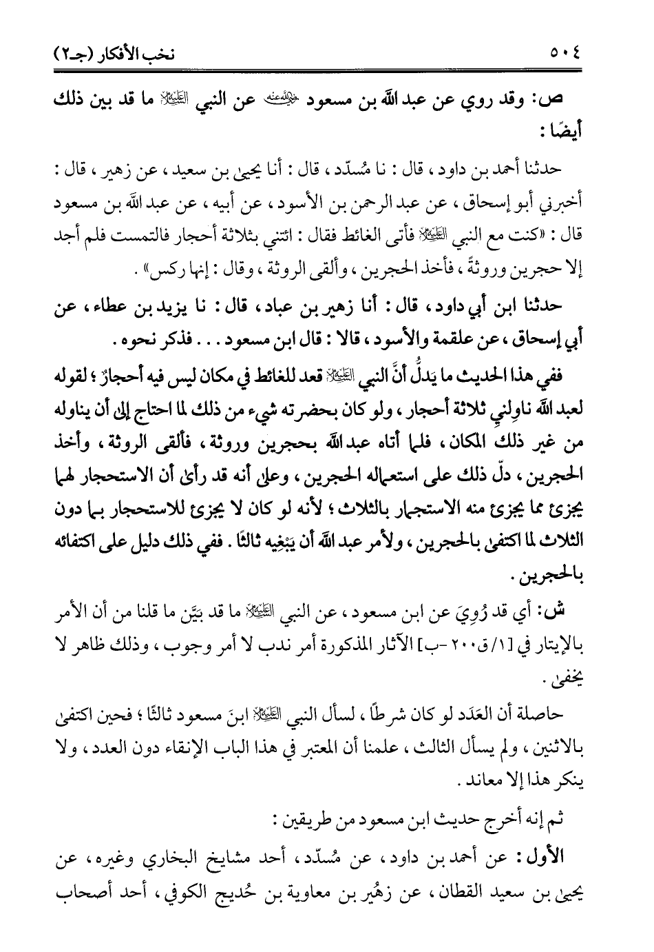 حاصلة أن العَدَد لو كان شرطًا، لسأل النبي - عليه السلام - ابنَ مسعود ثالثًا؛ فحين اكتفى بالاثنين, ولم يسأل الثالث، علمنا أن المعتبى في هذا الباب الإنقاء دون العدد، ولا ينكر هذا إلا معاند.