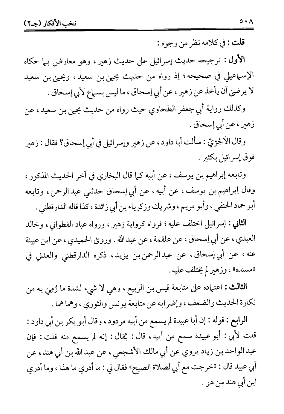 الثاني: إسرائيل اختلف عليه؛ فرواه كرواية زهير، ورواه عباد القطواني، وخالد العبدي، عن أبي إسحاق، عن علقمة، عن عبد الله. وروى الحميدي، عن ابن عيينة عنه، عن أبي إسحاق، عن عبد الرحمن بن يزيد، ذكره الدارقطني والعدني في "مسنده"، وزهير لم يختلف عليه.