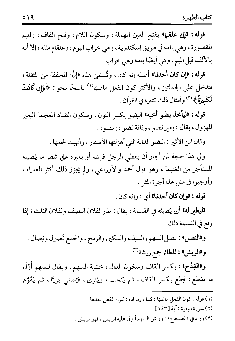 و"القِدْح": بكسر القاف وسكون الدال، خشبة السهم، ويقال للسهم أَوّلَ ما يقطع: قِطع بكسر القاف، ثم يُنْحت، ويُبْهرى، فيُسَمّي بَريًّا، ثم يُقَّوَّم
